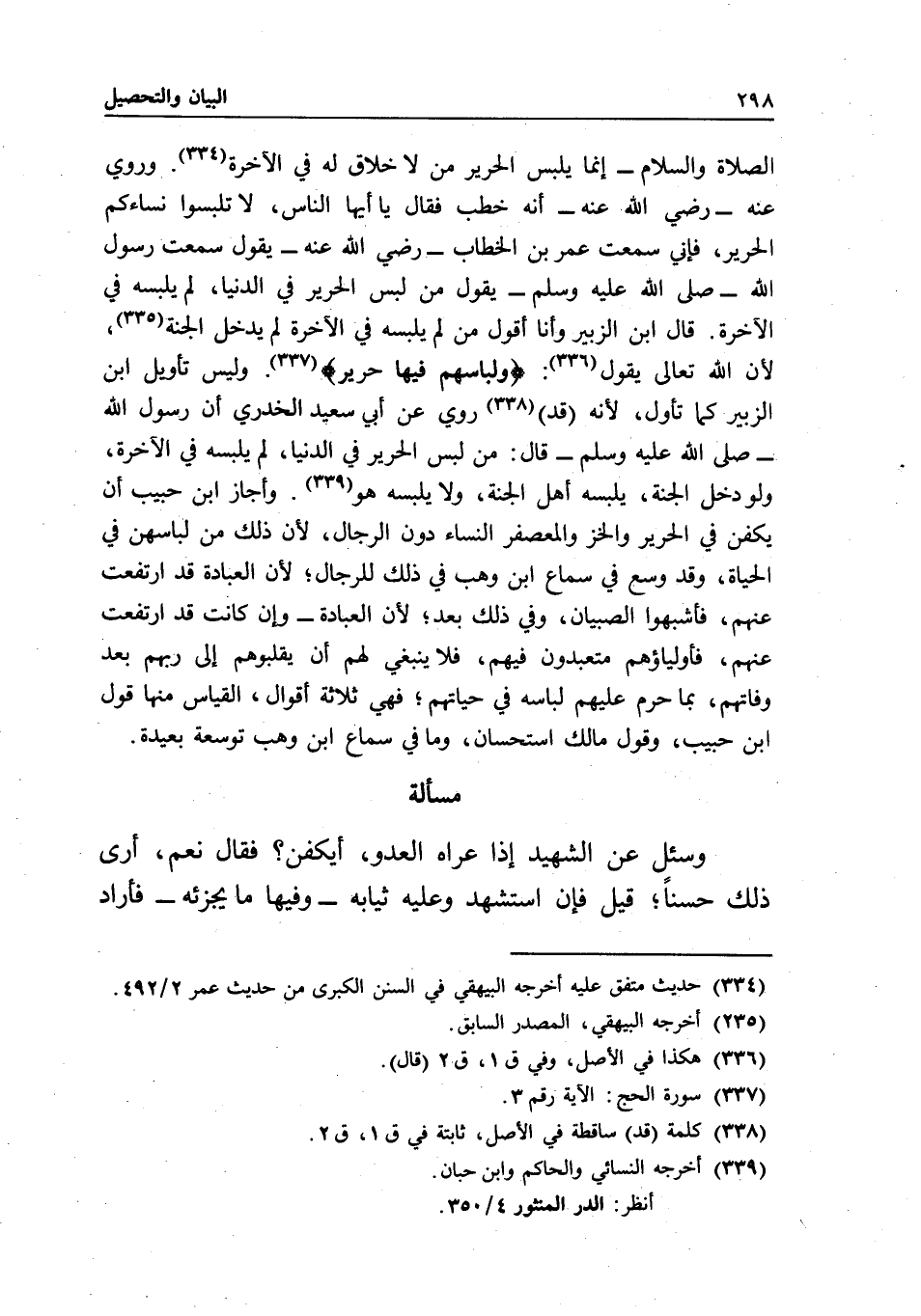 وأجاز ابن حبيب أن يكفن في الحرير والخز والمعصفر النساء دون الرجال؛ لأن ذلك من لباسهن في الحياة، وقد وسع في سماع ابن وهب في ذلك للرجال؛ لأن العبادة قد ارتفعت عنهم، فأشبهوا الصبيان، وفي ذلك بعد؛ لأن العبادة - وإن كانت قد ارتفعت عنهم، فأولياؤهم متعبدون فيهم، فلا ينبغي لهم أن يقلبوهم إلى ربهم بعد وفاتهم، بما حرم عليهم لباسه في حياتهم؛ فهي ثلاثة أقوال، القياس منها قول ابن حبيب، وقول مالك استحسان، وما في سماع ابن وهب توسعة بعيدة.