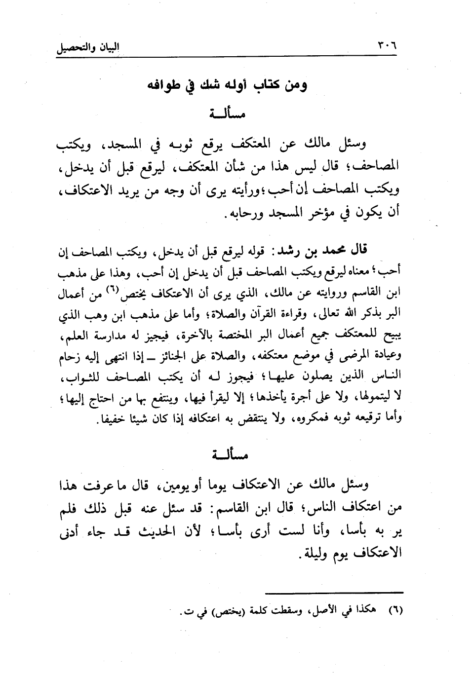ومن كتاب أوله شك في طوافه مسألة وسئل مالك: عن المعتكف يرقع ثوبه في المسجد، ويكتب المصاحف؛ قال: ليس هذا من شأن المعتكف، ليرقع قبل أن يدخل، ويكتب المصاحف إن أحب؛ ورأيته يرى أن وجه من يريد الاعتكاف أن يكون في مؤخر المسجد ورحابه.
