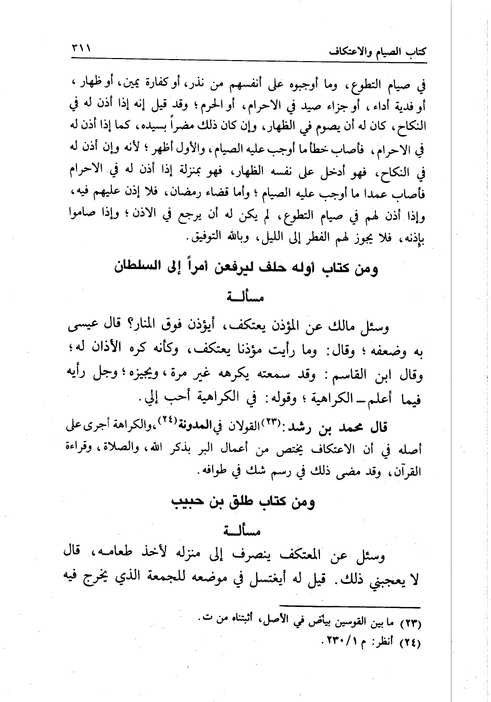ومن كتاب أوله حلف ليرفعن أمرا إلى السلطان مسألة وسئل مالك: عن المؤذن يعتكف، أيؤذن فوق المنار؟ قال عيسى به وضعفه؛ وقال: وما رأيت مؤذنا يعتكف، وكأنه كره الأذان له؛ وقال ابن القاسم: وقد سمعته يكرهه غير مرة، ويجيزه. وجل رأيه فيما أعلم - الكراهية؛ وقوله: في الكراهية أحب إلي.