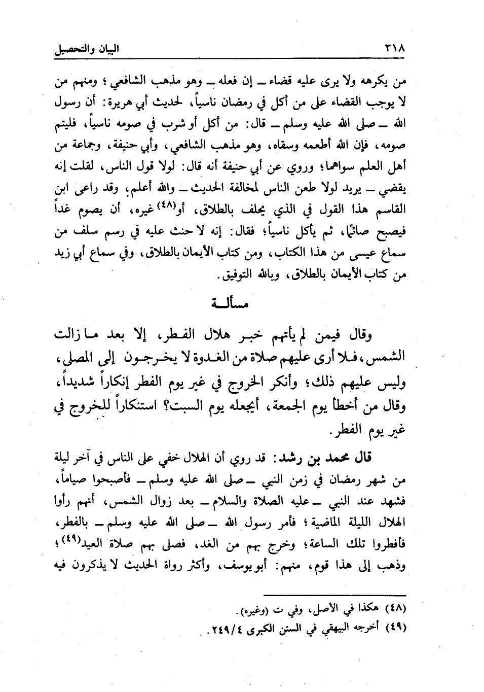 قال محمد بن رشد: قد روي أن الهلال خفي على الناس في آخر ليلة من شهر رمضان في زمن النبي - صَلَّى اللَّهُ عَلَيْهِ وَسَلَّمَ - فأصبحوا صياما، فشهد عند النبي - عَلَيْهِ الصَّلَاةُ وَالسَّلَامُ - بعد زوال الشمس أنهم رأوا الهلال الليلة الماضية، فأمر رسول الله - صَلَّى اللَّهُ عَلَيْهِ وَسَلَّمَ - بالفطر، فأفطروا تلك الساعة، وخرج بهم من الغد، فصلى بهم صلاة العيد، وذهب إلى هذا قوم، منهم: أبو يوسف. وأكثر رواة الحديث لا يذكرون فيه