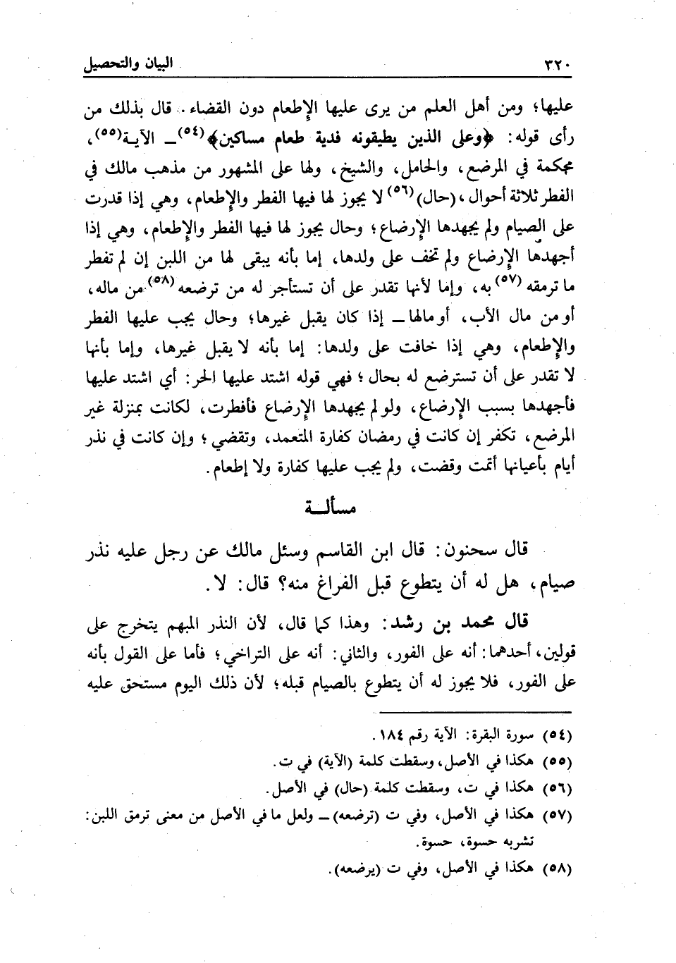 عليها؛ ومن أهل العلم من يرى عليها الإطعام دون القضاء. قال بذلك من رأى قوله: {وَعَلَى الَّذِينَ يُطِيقُونَهُ فِدْيَةٌ طَعَامُ مِسْكِينٍ} [البقرة: 184] ... الآية - محكمة في الموضع، والحامل، والشيخ. ولها على المشهور من مذهب مالك في الفطر ثلاثة أحوال: حال لا يجوز لها فيها الفطر والإطعام، وهي إذا قدرت على الصيام ولم يجهدها الإرضاع. وحال يجوز لها فيها الفطر والإطعام، وهي إذا أجهدها الإرضاع ولم تخف على ولدها، إما بأنه يبقى لها من اللبن إن لم تفطر ما ترمقه به، وإما لأنها تقدر على أن تستأجر له من ترضعه من ماله، أو من مال الأب، أو مالها، إذا كان يقبل غيرها. وحال يجب عليها الفطر والإطعام، وهي إذا خافت على ولدها، إما بأنه لا يقبل غيرها، وإما بأنها لا تقدر على أن تسترضع له بحال؛ فهي قوله "اشتد عليها الحر" أي: اشتد عليها فأجهدها بسبب الإرضاع، ولو لم يجهدها الإرضاع فأفطرت، لكانت بمنزلة غير المرضع، تكفر إن كانت في رمضان كفارة المتعمد، وتقضي، وإن كانت في نذر أيام بأعيانها أتمت وقضت، ولم يجب عليها كفارة ولا إطعام.
