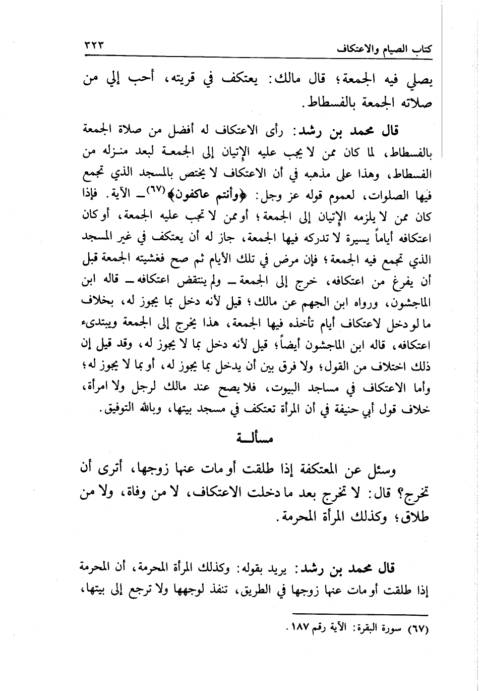 قال محمد بن رشد: رأى الاعتكاف له أفضل من صلاة الجمعة بالفسطاط، لما كان ممن لا يجب عليه الإتيان إلى الجمعة لبعد منزله من الفسطاط، وهذا على مذهبه في أن الاعتكاف لا يختص بالمسجد الذي تجمع فيها الصلوات، لعموم قوله عز وجل: {وَأَنْتُمْ عَاكِفُونَ} [البقرة: 187] ... الآية. فإذا كان ممن لا يلزمه الإتيان إلى الجمعة، أو ممن لا تجب عليه الجمعة، أو كان اعتكافه أياما يسيرة لا تدركه فيها الجمعة، جاز له أن يعتكف في غير المسجد الذي تجمع فيه الجمعة، فإن مرض في تلك الأيام ثم صح فغشيته الجمعة قبل أن يفرغ من اعتكافه، خرج إلى الجمعة - ولم ينتقض اعتكافه - قاله ابن الماجشون، ورواه ابن الجهم عن مالك؛ قيل: لأنه دخل بما يجوز له، بخلاف ما لو دخل لاعتكاف أيام تأخذه فيها الجمعة، هذا يخرج إلى الجمعة ويبتدئ اعتكافه، قاله ابن الماجشون أيضا. قيل: لأنه دخل بما لا يجوز له، وقد قيل: إن ذلك اختلاف من القول؛ ولا فرق بين أن يدخل بما يجوز له، أو بما لا يجوز له؛ وأما الاعتكاف في مساجد البيوت، فلا يصح عند مالك لرجل ولا امرأة، خلاف قول أبي حنيفة في أن المرأة تعتكف في مسجد بيتها، وبالله التوفيق.