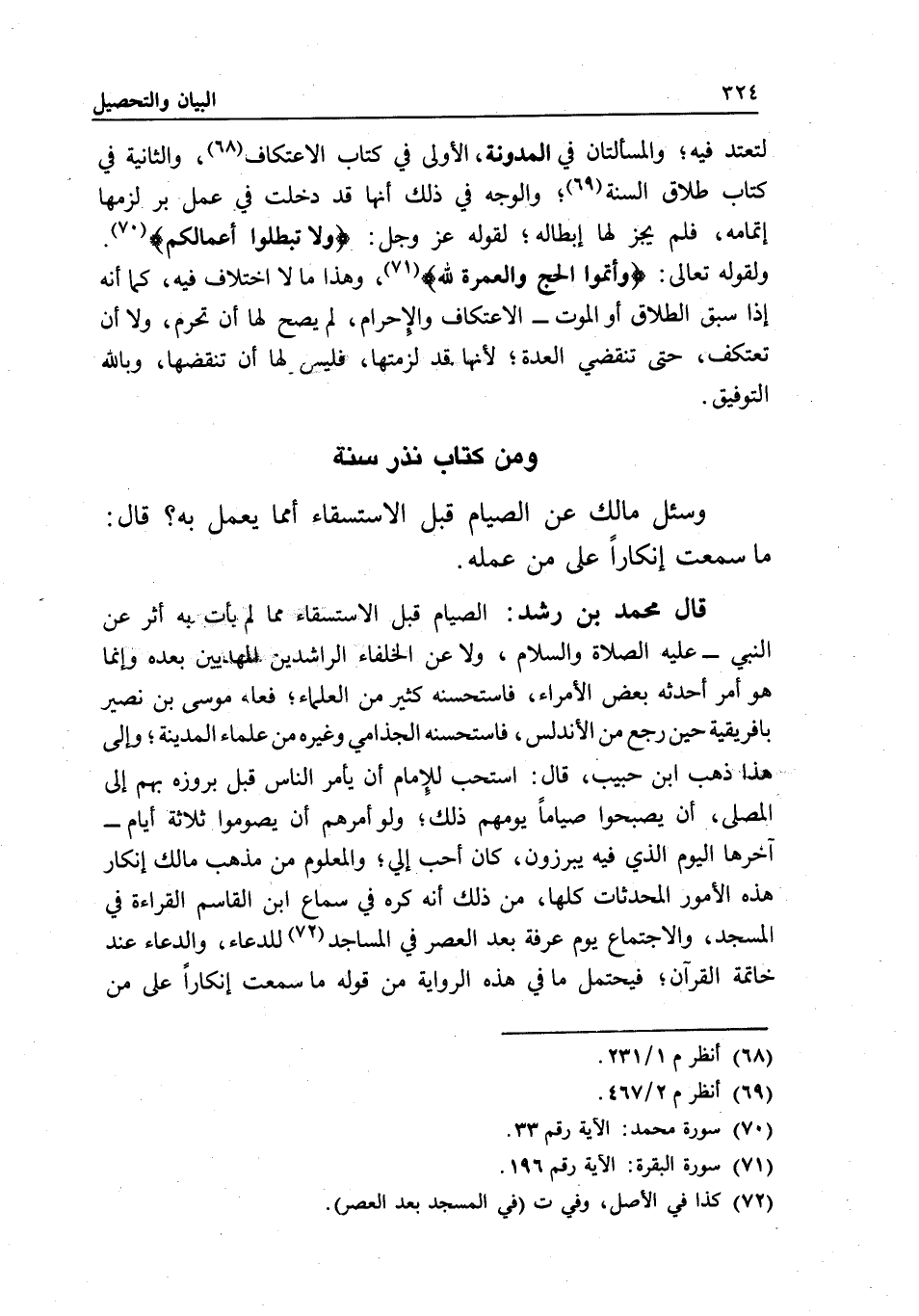 قال محمد بن رشد: الصيام قبل الاستسقاء مما لم يأت به أثر عن النبي - عَلَيْهِ الصَّلَاةُ وَالسَّلَامُ -، ولا عن الخلفاء الراشدين المهديين بعده، وإنما هو أمر أحدثه بعض الأمراء، فاستحسنه كثير من العلماء؛ فعله موسى بن نصير بإفريقية حين رجع من الأندلس، فاستحسنه الجذامي وغيره من علماء المدينة؛ وإلى هذا ذهب ابن حبيب، قال: استحب للإمام أن يأمر الناس قبل بروزه بهم إلى المصلى، أن يصبحوا صياما يومهم ذلك؛ ولو أمرهم أن يصوموا ثلاثة أيام - آخرها اليوم الذي فيه يبرزون، كان أحب إلي، والمعلوم من مذهب مالك إنكار هذه الأمور المحدثات كلها، من ذلك أنه كره في سماع ابن القاسم القراءة في المسجد، والاجتماع يوم عرفة بعد العصر في المساجد للدعاء، والدعاء عند خاتمة القرآن، فيحتمل ما في هذه الرواية من قوله ما سمعت إنكارا على من