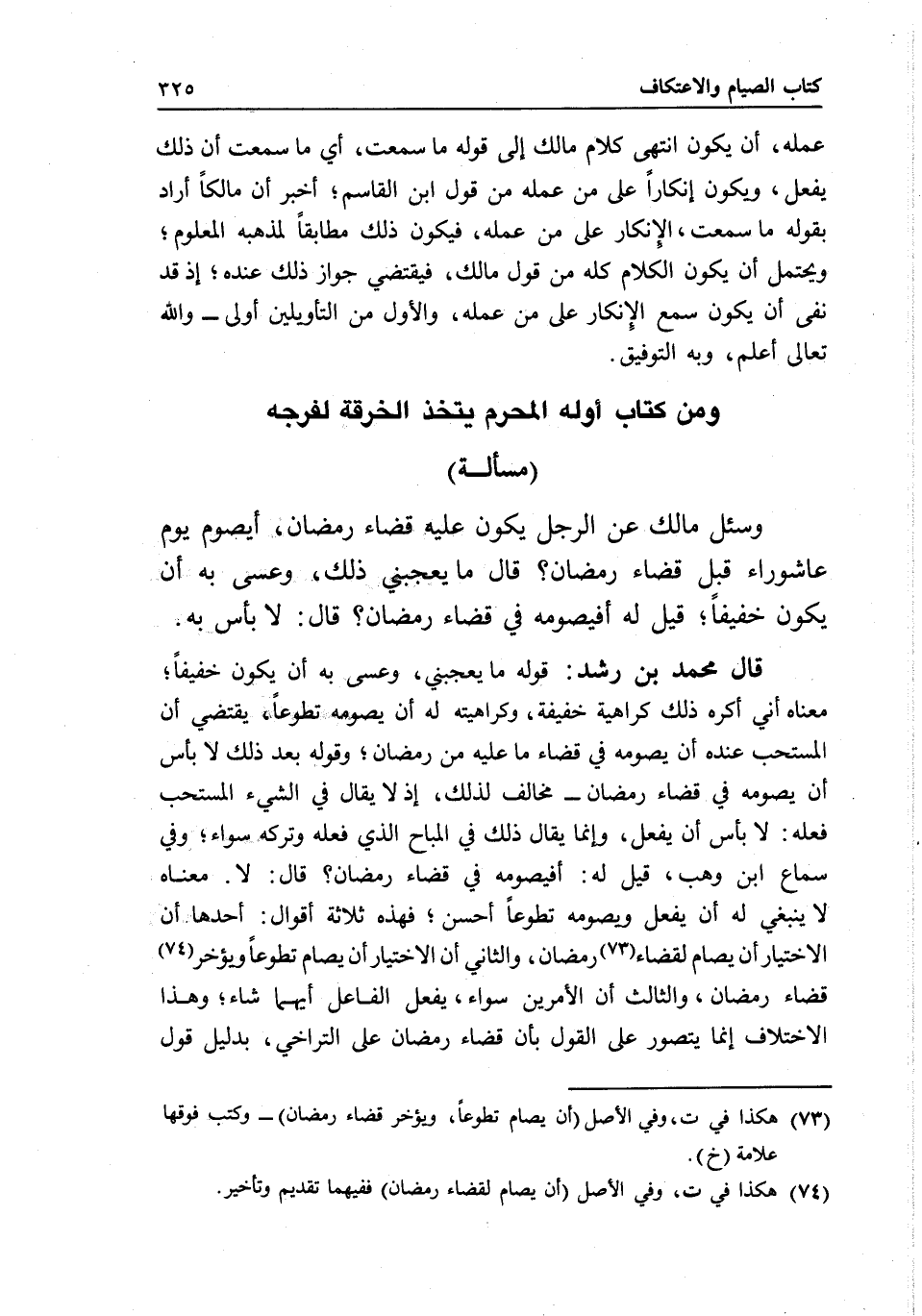 عمله، أن يكون انتهى كلام مالك إلى قوله ما سمعت، أي: ما سمعت أن ذلك يفعل، ويكون إنكارا على من عمله من قول ابن القاسم. أخبر أن مالكا أراد بقوله ما سمعت - الإنكار على من عمله، فيكون ذلك مطابقا لمذهبه المعلوم، ويحتمل أن يكون الكلام كله من قول مالك، فيقتضي جواز ذلك عنده؛ إذ قد نفى أن يكون سمع الإنكار على من عمله، والأول من التأويلين أولى - والله تعالى أعلم، وبه التوفيق.