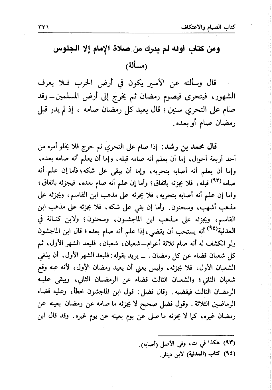 ومن كتاب أوله لم يدرك من صلاة الإمام إلا الجلوس مسألة قال: وسألته: عن الأسير يكون في أرض الحرب فلا يعرف الشهور، فيتحرى فيصوم رمضان ثم يخرج إلى أرض المسلمين - وقد صام على التحري سنين، قال: يعيد كل رمضان صامه، إذ لم يدر قبل رمضان صام أو بعده.