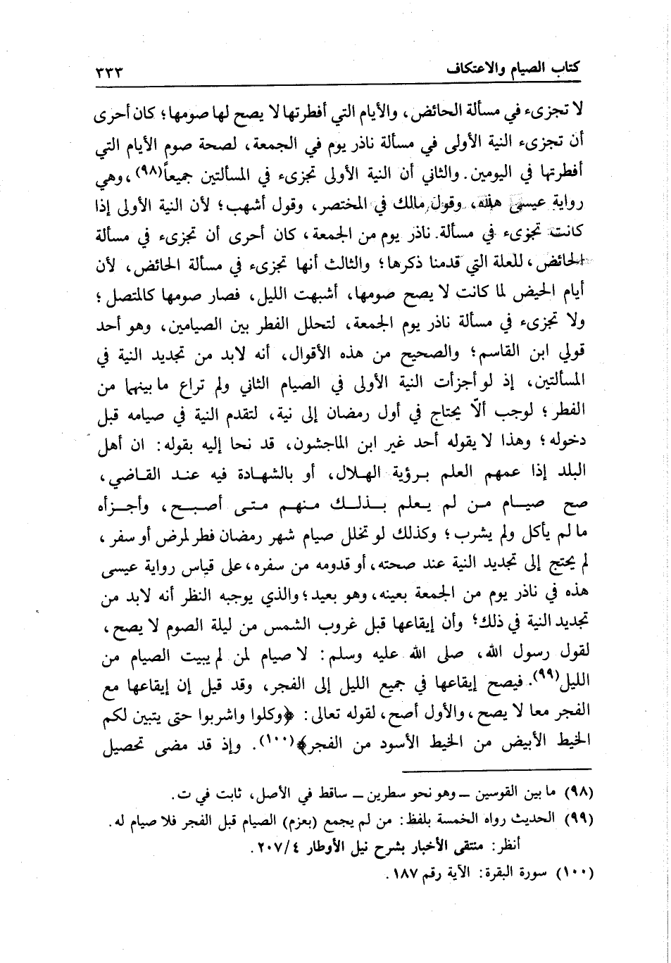 لا تجزئ في مسألة الحائض، والأيام التي أفطرتها لا يصح لها صومها؛ كان أحرى أن تجزئ النية الأولى في مسألة ناذر يوم في الجمعة، لصحة صوم الأيام التي أفطرتها في اليومين. والثاني: أن النية الأولى تجزئ في المسألتين جميعا، وهي رواية عيسى هذه، وقول مالك في المختصر، وقول أشهب؛ لأن النية الأولى إذا كانت تجزئ في مسألة ناذر يوم من الجمعة، كان أحرى أن تجزئ في مسألة الحائض، للعلة التي قدمنا ذكرها؛ والثالث: أنها تجزئ في مسألة الحائض؛ لأن أيام الحيض لما كانت لا يصح صومها، أشبهت الليل، فصار صومها كالمتصل، ولا تجزئ في مسألة ناذر يوم الجمعة، لتحلل الفطر بين الصيامين، وهو أحد قولي ابن القاسم. والصحيح من هذه الأقوال: أنه لا بد من تجديد النية في المسألتين، إذ لو أجزأت النية الأولى في الصيام الثاني ولم تراع ما بينهما من الفطر، لوجب ألا يحتاج في أول رمضان إلى نية، لتقدم النية في صيامه قبل دخوله، وهذا لا يقوله أحد غير ابن الماجشون، قد نحا إليه بقوله: إن أهل البلد إذا عمهم العلم برؤية الهلال، أو بالشهادة فيه عند القاضي، صح صيام من لم يعلم بذلك منهم متى أصبح، وأجزأه ما لم يأكل ولم يشرب، وكذلك لو تخلل صيام شهر رمضان فطر لمرض أو سفر، لم يحتج إلى تجديد النية عند صحته، أو قدومه من سفره، على قياس رواية عيسى هذه في ناذر يوم من الجمعة بعينه، وهو بعيد، والذي يوجبه النظر أنه لا بد من تجديد النية في ذلك، وأن إيقاعها قبل غروب الشمس من ليلة الصوم لا يصح، لقول رسول الله - صَلَّى اللَّهُ عَلَيْهِ وَسَلَّمَ -: «لا صيام لمن لم يبيت الصيام من الليل» . فيصح إيقاعها في جميع الليل إلى الفجر، وقد قيل: إن إيقاعها مع الفجر معا لا يصح، والأول أصح، لِقَوْلِهِ تَعَالَى: {وَكُلُوا وَاشْرَبُوا حَتَّى يَتَبَيَّنَ لَكُمُ الْخَيْطُ الأَبْيَضُ مِنَ الْخَيْطِ الأَسْوَدِ مِنَ الْفَجْرِ} [البقرة: 187] . وإذ قد مضى تحصيل