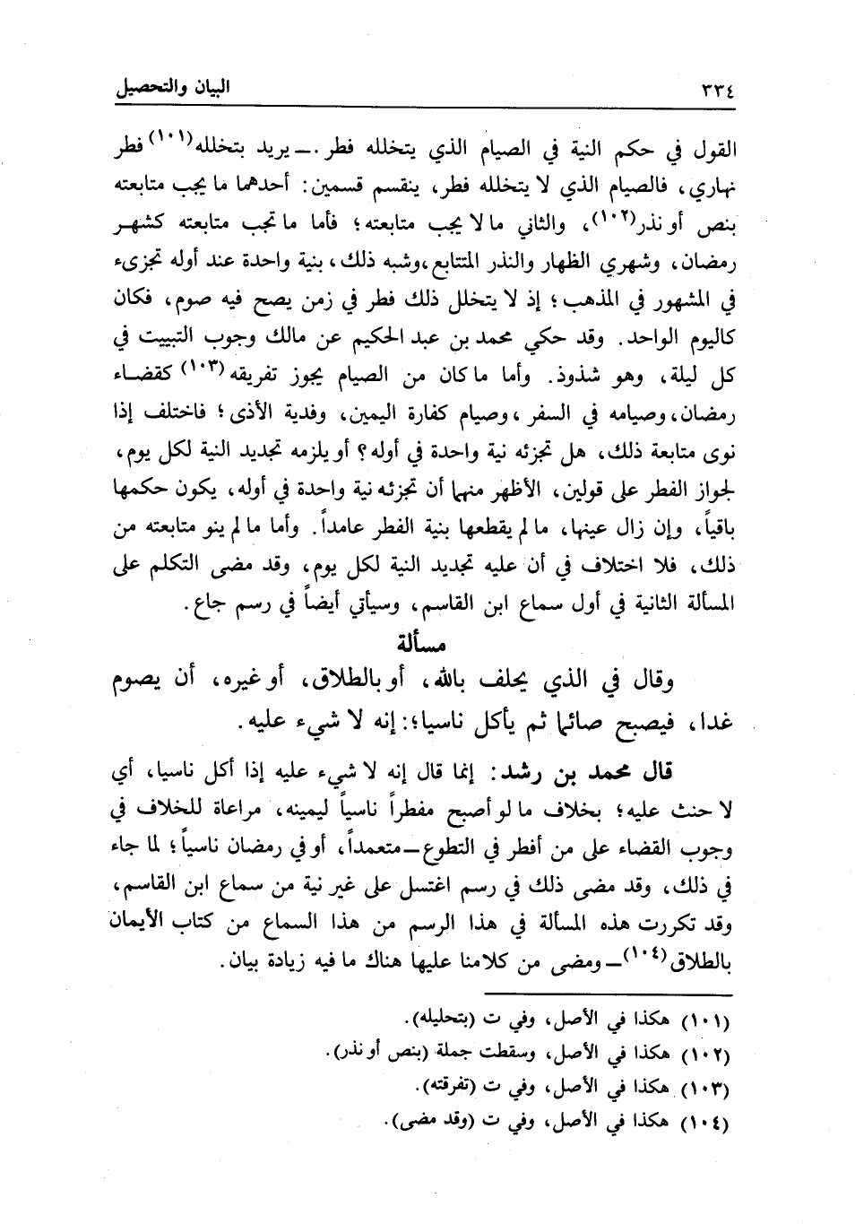 قال محمد بن رشد: إنما قال إنه لا شيء عليه إذا أكل ناسيا، أي: لا حنث عليه؛ بخلاف ما لو أصبح مفطرا ناسيا ليمينه، مراعاة للخلاف في وجوب القضاء على من أفطر في التطوع - متعمدا، أو في رمضان ناسيا، لما جاء في ذلك، وقد مضى ذلك في رسم "اغتسل على غير نية" من سماع ابن القاسم، وقد تكررت هذه المسألة في هذا الرسم من هذا السماع من كتاب الأيمان بالطلاق - ومضى من كلامنا عليها هناك ما فيه زيادة بيان.