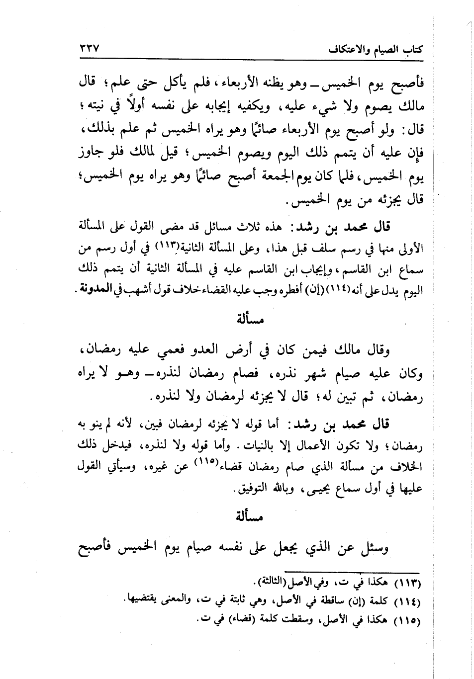 قال محمد بن رشد: هذه ثلاث مسائل قد مضى القول على المسألة الأولى منها في رسم "سلف" قبل هذا، وعلى المسألة الثانية في أول رسم من سماع ابن القاسم، وإيجاب ابن القاسم عليه في المسألة الثانية أن يتمم ذلك اليوم يدل على أنه إن أفطره وجب عليه القضاء خلاف قول أشهب في المدونة.