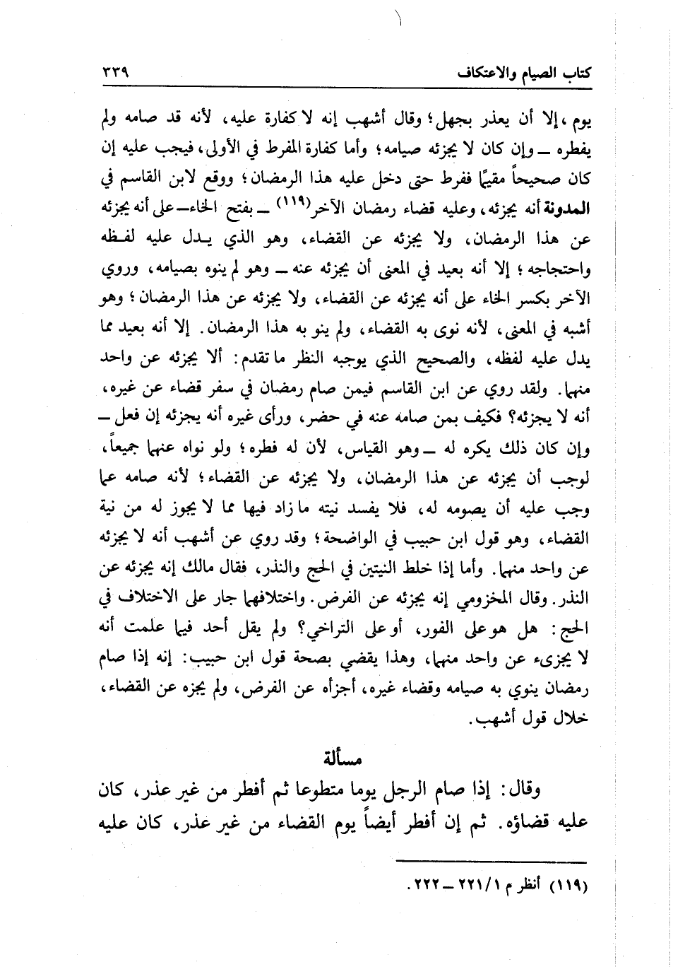 يوم، إلا أن يعذر بجهل؛ وقال أشهب: إنه لا كفارة عليه؛ لأنه قد صامه ولم يفطره - وإن كان لا يجزئه صيامه، وأما كفارة المفرط في الأولى، فيجب عليه إن كان صحيحا مقيما ففرط حتى دخل عليه هذا الرمضان؛ ووقع لابن القاسم في المدونة أنه يجزئه، وعليه قضاء رمضان الآخر - بفتح الخاء - على أنه يجزئه عن هذا الرمضان، ولا يجزئه عن القضاء، وهو الذي يدل عليه لفظه واحتجاجه، إلا أنه بعيد في المعنى أن يجزئه عنه - وهو لم ينوه بصيامه، وروي الآخر بكسر الخاء على أنه يجزئه عن القضاء، ولا يجزئه عن هذا الرمضان؛ وهو أشبه في المعنى؛ لأنه نوى به القضاء، ولم ينو به هذا الرمضان، إلا أنه بعيد مما يدل عليه لفظه، والصحيح الذي يوجبه النظر ما تقدم: ألا يجزئه عن واحد منهما. ولقد روي عن ابن القاسم فيمن صام رمضان في سفر قضاء عن غيره، أنه لا يجزئه، فكيف بمن صامه عنه في حضر، ورأى غيره أنه يجزئه إن فعل - وإن كان ذلك يكره له - وهو القياس؛ لأن له فطره؛ ولو نواه عنهما جميعا، لوجب أن يجزئه عن هذا الرمضان، ولا يجزئه عن القضاء؛ لأنه صامه عما وجب عليه أن يصومه له، فلا يفسد نيته ما زاد فيها مما لا يجوز له من نية القضاء، وهو قول ابن حبيب في الواضحة؛ وقد روي عن أشهب: أنه لا يجزئه عن واحد منهما. وأما إذا خلط النيتين في الحج والنذر، فقال مالك: إنه يجزئه عن النذر. وقال المخزومي: إنه يجزئه عن الفرض. واختلافهما جار على الاختلاف في الحج: هل هو على الفور، أو على التراخي؟ ولم يقل أحد فيما علمت أنه لا يجزئ عن واحد منهما، وهذا يقضي بصحة قول ابن حبيب: إنه إذا صام رمضان ينوي به صيامه وقضاء غيره، أجزأه عن الفرض، ولم يجزه عن القضاء، خلاف قول أشهب.