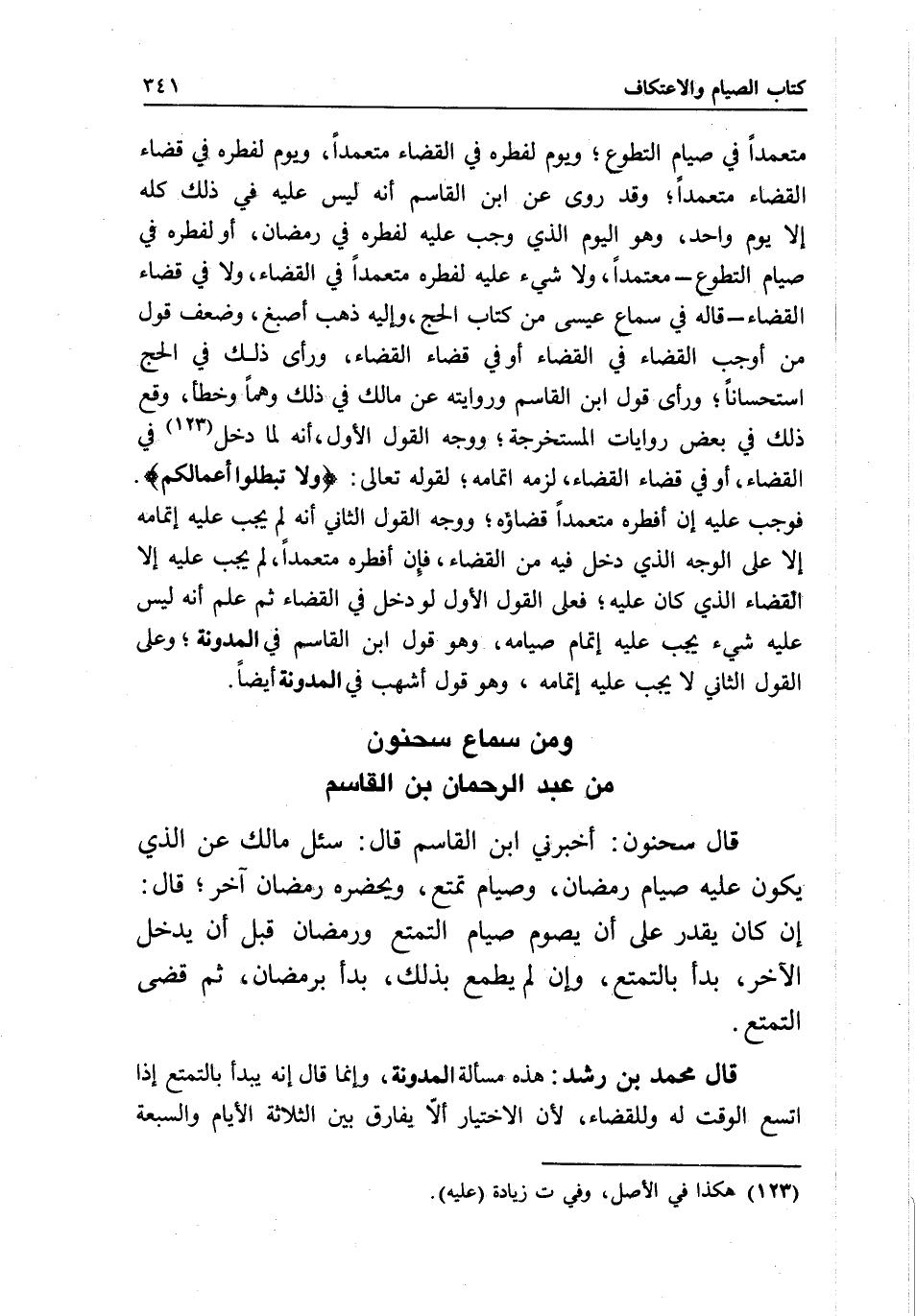 متعمدا في صيام التطوع؛ ويوم لفطره في القضاء متعمدا، ويوم لفطره في قضاء القضاء متعمدا، وقد روى عن ابن القاسم: أنه ليس عليه في ذلك كله إلا يوم واحد، وهو اليوم الذي وجب عليه لفطره في رمضان، أو لفطره في صيام التطوع - معتمدا، ولا شيء عليه لفطره متعمدا في القضاء، ولا في قضاء القضاء - قاله في سماع عيسى من كتاب الحج، وإليه ذهب أصبغ، وضعف قول من أوجب القضاء في القضاء أو في قضاء القضاء، ورأى ذلك في الحج استحسانا، ورأى قول ابن القاسم وروايته عن مالك في ذلك وهما وخطأ، وقع ذلك في بعض روايات المستخرجة، ووجه القول الأول، أنه لما دخل في القضاء، أو في قضاء القضاء، لزمه إتمامه؛ لِقَوْلِهِ تَعَالَى: {وَلا تُبْطِلُوا أَعْمَالَكُمْ} [محمد: 33] . فوجب عليه إن أفطره متعمدا قضاؤه؛ ووجه القول الثاني أنه لم يجب عليه إتمامه إلا على الوجه الذي دخل فيه من القضاء، فإن أفطره متعمدا، لم يجب عليه إلا القضاء الذي كان عليه؛ فعلى القول الأول لو دخل في القضاء ثم علم أنه ليس عليه شيء يجب عليه إتمام صيامه، وهو قول ابن القاسم في المدونة؛ وعلى القول الثاني لا يجب عليه إتمامه، وهو قول أشهب في المدونة أيضا.