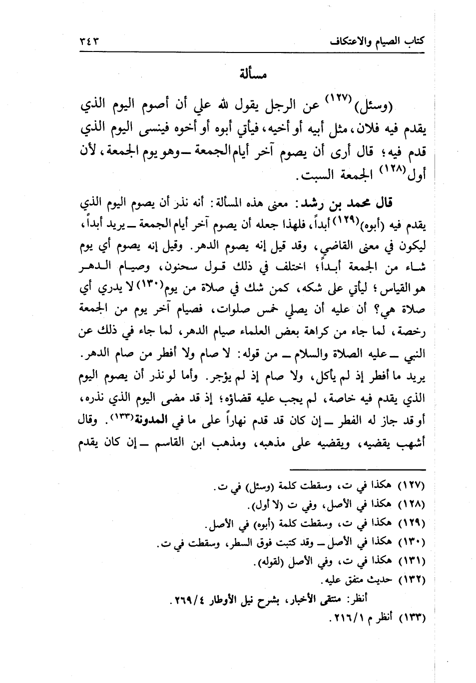 مسألة وسئل: عن الرجل يقول: لله علي أن أصوم اليوم الذي يقدم فيه فلان، مثل أبيه أو أخيه، فيأتي أبوه أو أخوه فينسى اليوم الذي قدم فيه؟ قال: أرى أن يصوم آخر أيام الجمعة - وهو يوم الجمعة؛ لأن أول الجمعة السبت.