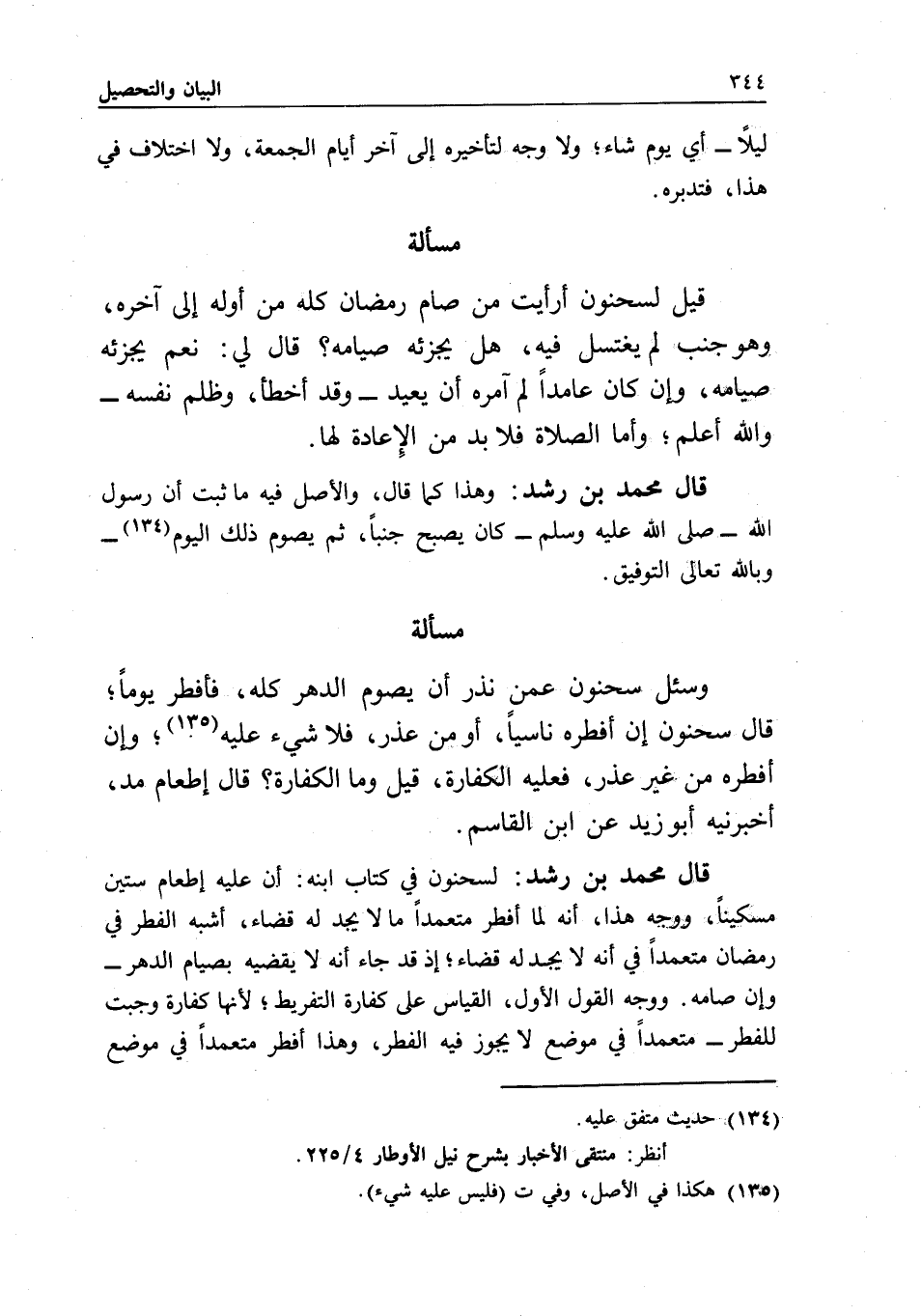 قال محمد بن رشد: وهذا كما قال، والأصل فيه ما ثبت أن رسول الله - صَلَّى اللَّهُ عَلَيْهِ وَسَلَّمَ - كان يصبح جنبا، ثم يصوم ذلك اليوم - وبالله تعالى التوفيق.