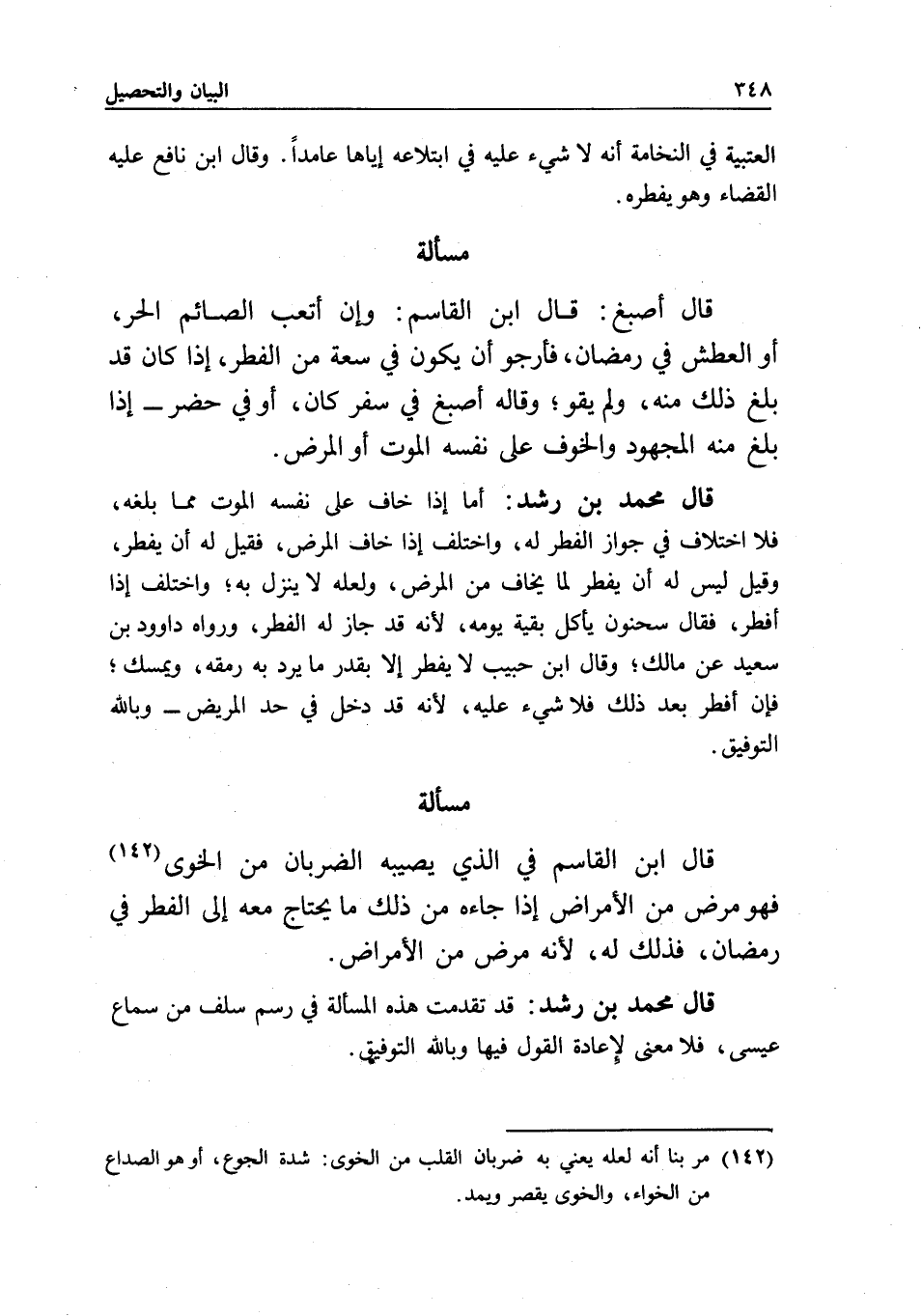 مسألة قال ابن القاسم في الذي يصيبه الضربان من الخوى، فهو مرض من الأمراض إذا جاءه من ذلك ما يحتاج معه إلى الفطر في رمضان، فذلك له؛ لأنه مرض من الأمراض.