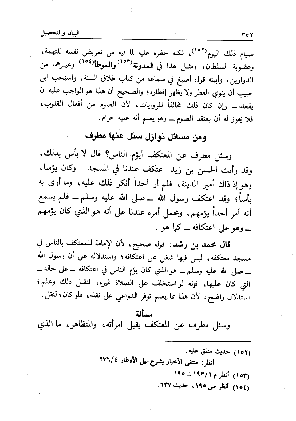 ومن مسائل نوازل سئل عنها مطرف وسئل مطرف: عن المعتكف أيؤم الناس؟ قال: لا بأس بذلك، وقد رأيت الحسن بن زيد اعتكف عندنا في المسجد، وكان يؤمنا، وهو إذ ذاك أمير المدينة، فلم أر أحدا أنكر ذلك عليه، وما أرى به بأسا، وقد اعتكف رسول الله - صَلَّى اللَّهُ عَلَيْهِ وَسَلَّمَ - فلم يسمع أنه أمر أحدا يؤمهم، ومحمل أمره عندنا على أنه هو الذي كان يؤمهم - وهو على اعتكافه - كما هو.