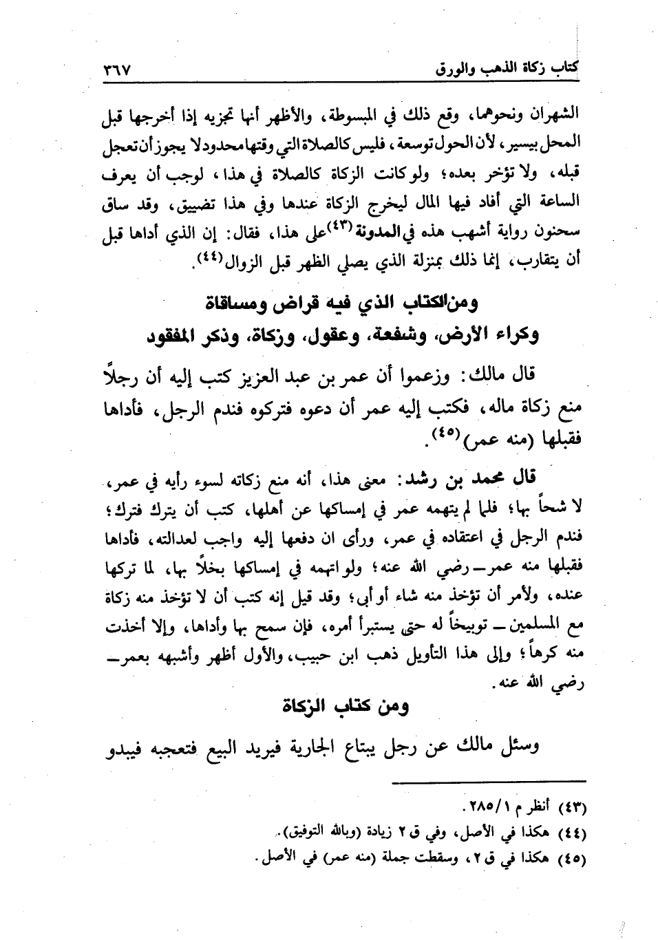 قال محمد بن رشد: معنى هذا، أنه منع زكاته لسوء رأيه في عمر، لا شحا بها؛ فلما لم يتهمه عمر في إمساكها عن أهلها، كتب أن يترك فترك؛ فندم الرجل في اعتقاده في عمر، ورأى أن دفعها إليه واجب لعدالته، فأداها فقبلها منه عمر - رَضِيَ اللَّهُ عَنْهُ -، ولو اتهمه في إمساكها بخلا بها، لما تركها عنده، ولأمر أن تؤخذ منه شاء أو أبى، وقد قيل: إنه كتب أن لا تؤخذ منه زكاة مع المسلمين - توبيخا له حتى يستبرأ أمره، فإن سمح بها وأداها، وإلا أخذت منه كرها؛ وإلى هذا التأويل ذهب ابن حبيب، والأول أظهر وأشبهه بعمر - رَضِيَ اللَّهُ عَنْهُ -.