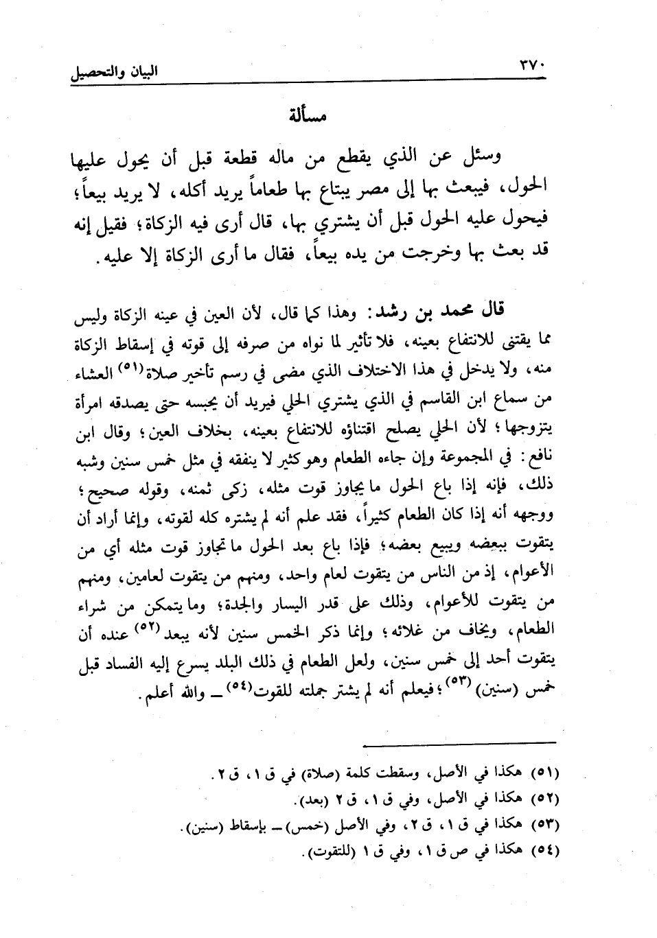 قال محمد بن رشد: وهذا كما قال؛ لأن العين في عينه الزكاة وليس مما يقتنى للانتفاع بعينه، فلا تأثير لما نواه من صرفه إلى قوته في إسقاط الزكاة منه، ولا يدخل في هذا الاختلاف الذي مضى في رسم "تأخير صلاة العشاء" من سماع ابن القاسم في الذي يشتري الحلي فيريد أن يحبسه حتى يصدقه امرأة يتزوجها؛ لأن الحلي يصلح اقتناؤه للانتفاع بعينه، بخلاف العين.