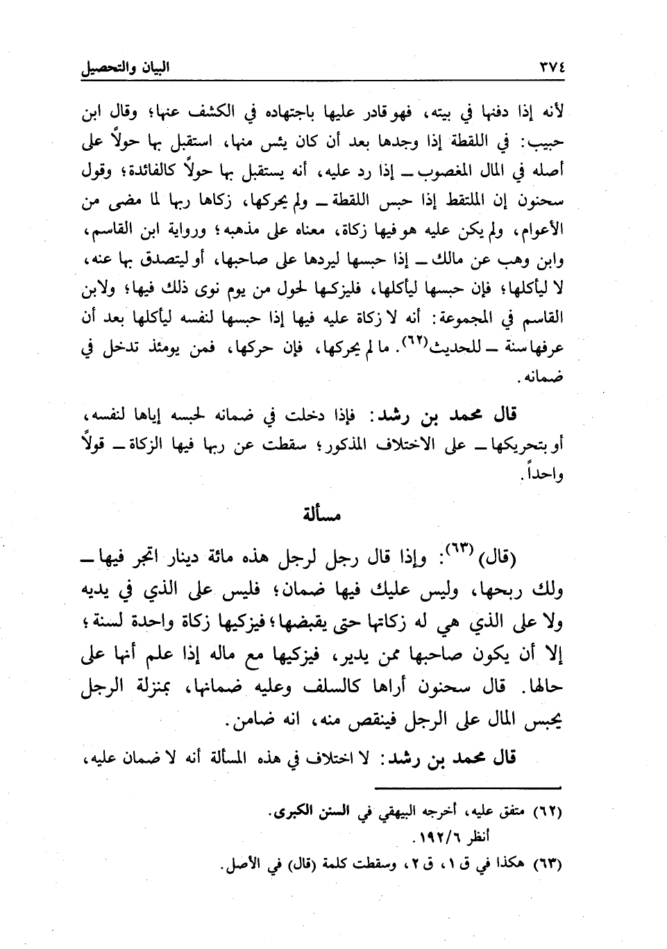 لأنه إذا دفنها في بيته، فهو قادر عليها باجتهاده في الكشف عنها؛ وقال ابن حبيب: في اللقطة إذا وجدها بعد أن كان يئس منها، استقبل بها حولا على أصله في المال المغصوب - إذا رد عليه، أنه يستقبل بها حولا كالفائدة، وقول سحنون: إن الملتقط إذا حبس اللقطة - ولم يحركها، زكاها ربها لما مضى من الأعوام، ولم يكن عليه هو فيها زكاة، معناه على مذهبه؛ ورواية ابن القاسم، وابن وهب عن مالك - إذا حبسها ليردها على صاحبها، أو ليتصدق بها عنه، لا ليأكلها؛ فإن حبسها ليأكلها، فليزكها لحول من يوم نوى ذلك فيها؛ ولابن القاسم في المجموعة: أنه لا زكاة عليه فيها إذا حبسها لنفسه ليأكلها بعد أن عرفها سنة - للحديث. ما لم يحركها، فإن حركها، فمن يومئذ تدخل في ضمانه.