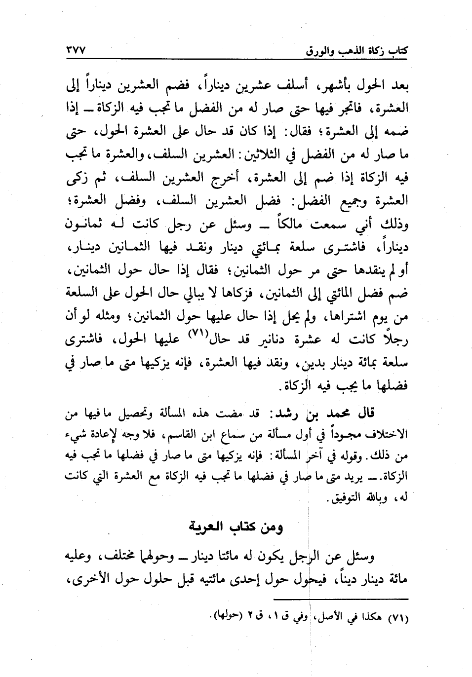 بعد الحول بأشهر، أسلف عشرين دينارا، فضم العشرين دينارا إلى العشرة، فاتجر فيها حتى صار له من الفضل ما تجب فيه الزكاة - إذا ضمه إلى العشرة؛ فقال: إذا كان قد حال على العشرة الحول، حتى ما صار له من الفضل في الثلاثين: العشرين السلف، والعشرة ما تجب فيه الزكاة إذا ضم إلى العشرة، أخرج العشرين السلف، ثم زكى العشرة وجميع الفضل: فضل العشرين السلف، وفضل العشرة؛ وذلك أني سمعت مالكا - وسئل عن رجل كانت له ثمانون دينارا، فاشترى سلعة بمائتي دينار ونقد فيها الثمانين دينار، أو لم ينقدها حتى مر حول الثمانين؛ فقال: إذا حال حول الثمانين، ضم فضل المائتي إلى الثمانين، فزكاها لا يبالي حال الحول على السلعة من يوم اشتراها، ولم يحل إذا حال عليها حول الثمانين؛ ومثله لو أن رجلا كانت له عشرة دنانير قد حال عليها الحول، فاشترى سلعة بمائة دينار بدين، ونقد فيها العشرة، فإنه يزكيها متى ما صار في فضلها ما يجب فيه الزكاة.