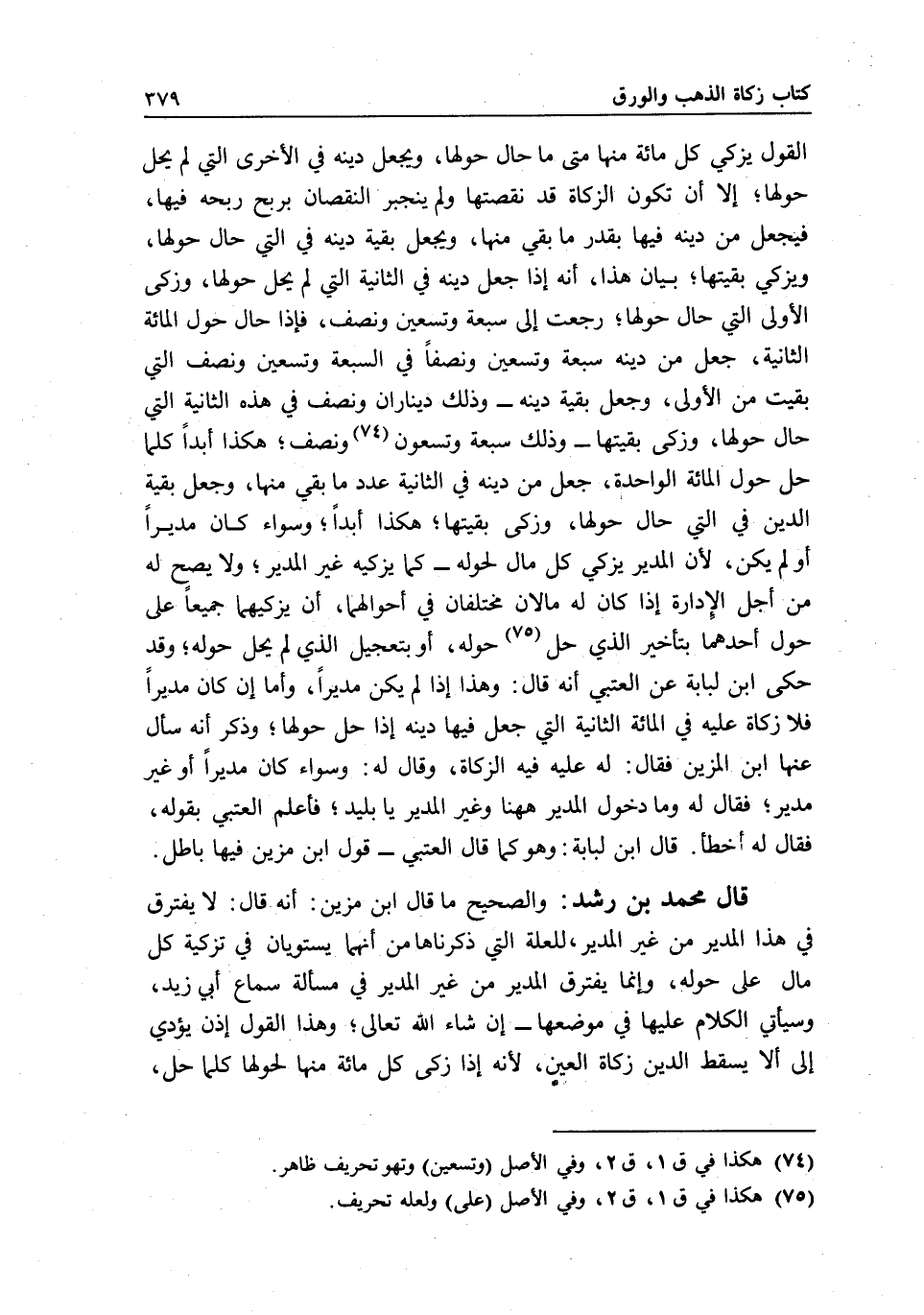 قال محمد بن رشد: والصحيح ما قال ابن مزين: أنه قال: لا يفترق في هذا المدير من غير المدير، للعلة التي ذكرناها من أنهما يستويان في تزكية كل مال على حوله، وإنما يفترق المدير من غير المدير في مسألة سماع أبي زيد، وسيأتي الكلام عليها في موضعها - إن شاء الله تعالى؛ وهذا القول إذن يؤدي إلى ألا يسقط الدين زكاة العين؛ لأنه إذا زكى كل مائة منها لحولها كلما حل،