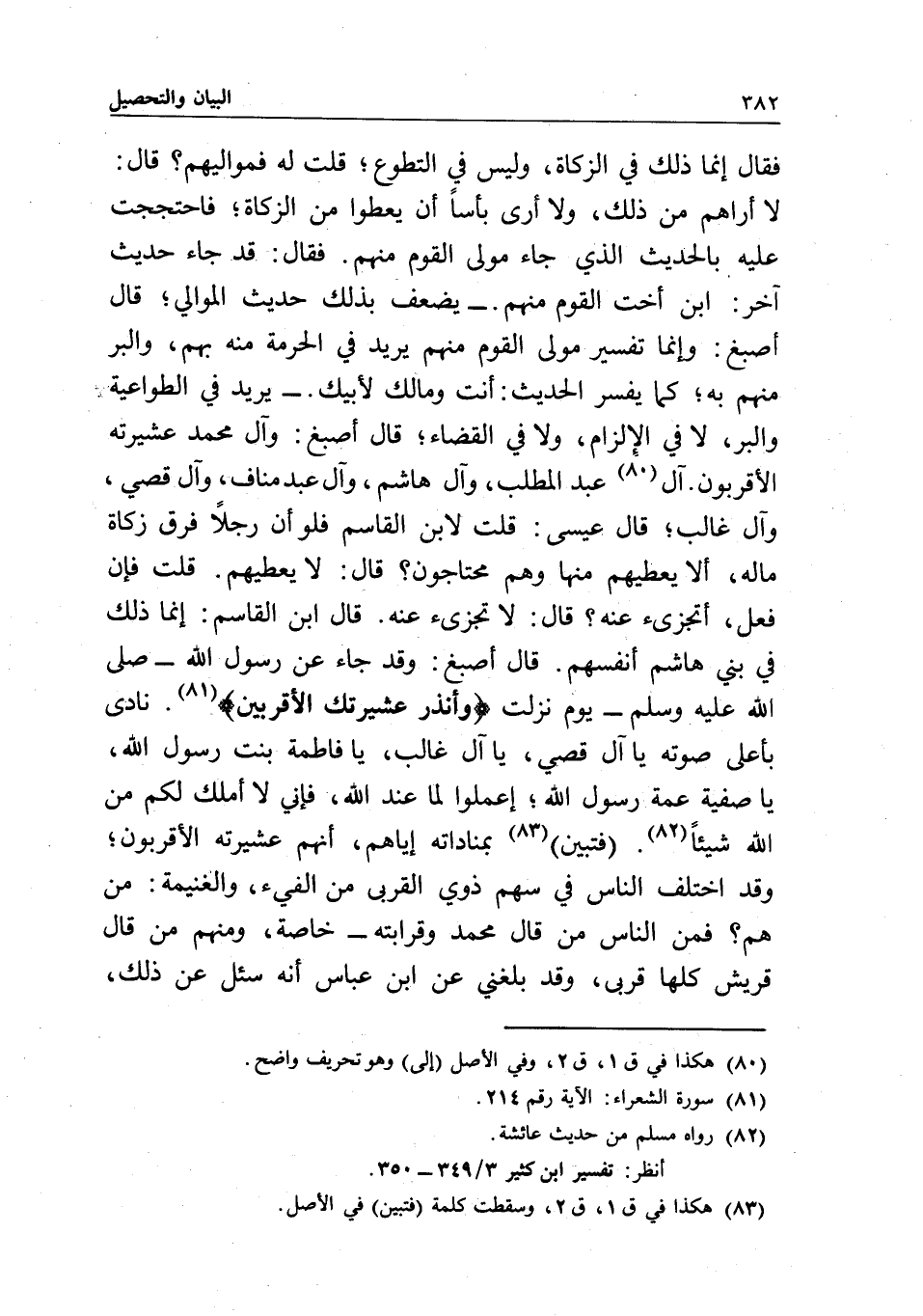 فقال: إنما ذلك في الزكاة، وليس في التطوع؛ قلت له: فمواليهم؟ قال: لا أراهم من ذلك، ولا أرى بأسا أن يُعْطَوْا من الزكاة؛ فاحتججت عليه بالحديث الذي جاء «مولى القوم منهم» . فقال: قد جاء حديث آخر: «ابن أخت القوم منهم» - يضعف بذلك حديث الموالي؛ قال أصبغ: وإنما تفسير «مولى القوم منهم» يريد في الحرمة منه بهم، والبر منهم به، كما يفسر الحديث: «أنت ومالك لأبيك» - يريد في الطواعية والبر، لا في الإلزام، ولا في القضاء؛ قال أصبغ: وآل محمد عشيرته الأقربون: آل عبد المطلب، وآل هاشم، وآل عبد مناف، وآل قصي، وآل غالب.