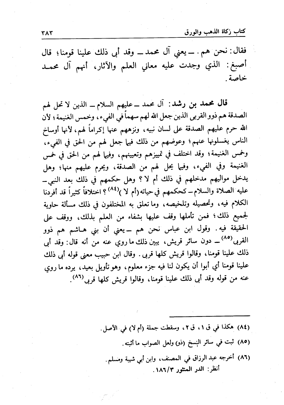 قال محمد بن رشد: آل محمد - عَلَيْهِمْ السَّلَامُ - الذين لا تحل لهم الصدقة هم ذوو القربى الذين جعل الله لهم سهما في الفيء، وخمس الغنيمة؛ لأن الله حرم عليهم الصدقة على لسان نبيه، ونزههم عنها إكراما لهم؛ لأنها أوساخ الناس يغسلونها عنهم، وعوضهم من ذلك فيما جعل لهم من الحق في الفيء، وخمس الغنيمة، وقد اختلف في تمييزهم وتعيينهم، وفيما لهم من الحق في خمس الغنيمة وفي الفيء، وفيما يحل لهم من الصدقة، ويحرم عليهم منها؛ وهل يدخل مواليهم مدخلهم في ذلك أم لا؟ وهل حكمهم في ذلك بعد النبي - عَلَيْهِ الصَّلَاةُ وَالسَّلَامُ - كحكمهم في حياته أم لا؟ اختلافا كثيرا قد أفردنا الكلام فيه، وتحصيله وتلخيصه، وما تعلق به المختلفون في ذلك مسألة حاوية لجميع ذلك؛ فمن تأملها وقف عليها بشفاء من العلم بذلك، ووقف على الحقيقة فيه. وقول ابن عباس نحن هم - يعني أن بني هاشم هم ذوو القربى - دون سائر قريش، يبين ذلك ما روي عنه من أنه قال: وقد أبى ذلك علينا قومنا، وقالوا: قريش كلها قربى. وقال ابن حبيب: معنى قوله أبى ذلك علينا قومنا أي أبوا أن يكون لنا فيه جزء معلوم، وهو تأويل بعيد، يرده ما روي عنه من قوله، وقد أبى ذلك علينا قومنا، وقالوا: قريش كلها قربى.