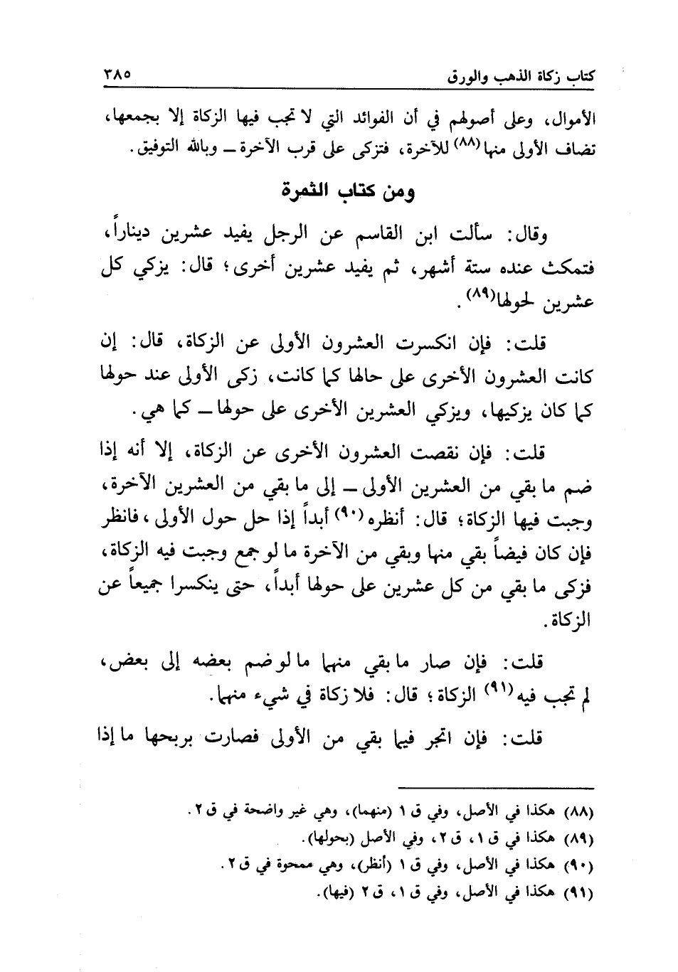 قلت: فإن انكسرت العشرون الأولى عن الزكاة، قال: إن كانت العشرون الأخرى على حالها كما كانت، زكى الأولى عند حولها كما كان يزكيها، ويزكي العشرين الأخرى على حولها - كما هي.