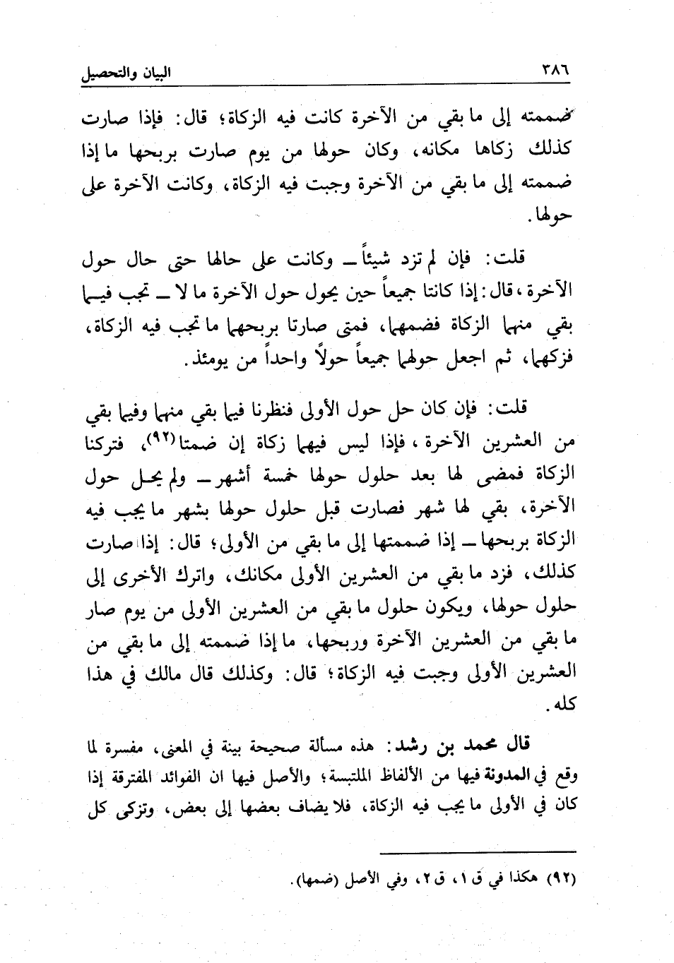 قال محمد بن رشد: هذه مسألة صحيحة بيّنة في المعنى، مفسرة لما وقع في المدونة فيها من الألفاظ الملتبسة، والأصل فيها أن الفوائد المفترقة إذا كان في الأولى ما يجب فيه الزكاة، فلا يضاف بعضها إلى بعض، وتزكى كل