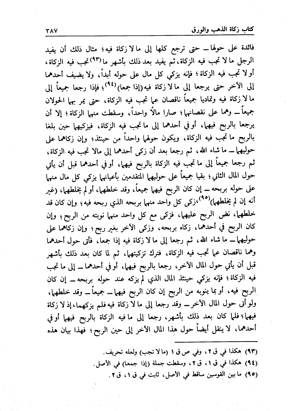 فائدة على حولها - حتى ترجع كلها إلى ما لا زكاة فيه؛ مثال ذلك أن يفيد الرجل ما لا تجب فيه الزكاة، ثم يفيد بعد ذلك بأشهر ما تجب فيه الزكاة، أو لا تجب فيه الزكاة؛ فإنه يزكي كل مال على حوله أبدا، ولا يضيف أحدهما إلى الآخر حتى يرجعا إلى ما لا زكاة فيه (إذا جمعا) فإذا رجعا جميعا إلى ما لا زكاة فيه، وتماديا جميعا ناقصان عما تجب فيه الزكاة، حتى يمر بهما الحولان جميعا - وهما على نقصانهما؛ صارا مالا واحدا، وسقطت منهما الزكاة؛ إلا أن يرجعا بالربح فيهما، أو في أحدهما إلى ما تجب فيه الزكاة، فيزكيهما حين بلغا بالربح ما تجب فيه الزكاة، ويكون حولهما واحدا من حينئذ، وإن زكاهما على حوليهما - ما شاء الله، ثم رجعا بعد أن زكى أحدهما إلى ما لا تجب فيه الزكاة، ثم رجعا جميعا إلى ما تجب فيه الزكاة بالربح فيهما، أو في أحدهما قبل أن يأتي حول المال الثاني، بقيا جميعا على حوليهما المتقدمين بأعيانهما يزكي كل مال منهما على حوله بربحه - إن كان الربح فيهما جميعا، وقد خلطهما، أو لم يخلطهما، (غير أنه إن لم يخلطهما) زكى كل واحد منهما بربحه الذي ربحه فيه، وإن كان قد خلطهما، نضّ الربح عليهما، فزكى مع كل واحد منهما نوبته من الربح، وإن كان الربح في أحدهما، زكاه بربحه، وزكى الآخر بغير ربح؛ وإن زكاهما على حوليهما - ما شاء الله، ثم رجعا إلى ما لا زكاة فيه إذا جمعا، فأتى حول أحدهما وهما ناقصان عما تجب فيه الزكاة، فترك تزكيتهما، ثم لما كان بعد ذلك بأشهر قبل أن يأتي حول المال الآخر، رجعا بالربح فيهما، أو في أحدهما - إلى ما تجب فيه الزكاة، فإنه يزكي حينئذ المال الذي لم يزكه عند حوله بربحه - إن كان الربح فيه، أو بما ينوبه من الربح إن كان الربح فيهما - جميعا - وقد خلطهما، ولو أتى حول المال الآخر - وقد رجعا إلى ما لا زكاة فيه فلم يزكهما؛ إذ لا زكاة فيهما، فلما كان بعد ذلك بأشهر، رجعا إلى ما فيه الزكاة بالربح فيهما أو في أحدهما، لا ينقل أيضا حول هذا المال الآخر إلى حين الربح؛ فهذا بيان هذه
