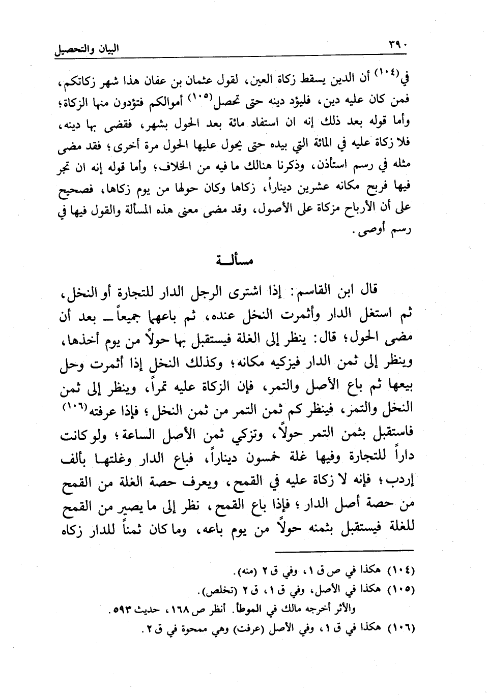 مسألة قال ابن القاسم: إذا اشترى الرجل الدار للتجارة أو النخل، ثم استغل الدار، وأثمرت النخل عنده، ثم باعهما جميعا - بعد أن مضى الحول، قال: ينظر إلى الغلة، فيستقبل بها حولا من يوم أخذها، وينظر إلى ثمن الدار، فيزكيه مكانه؛ وكذلك النخل إذا أثمرت وحل بيعها، ثم باع الأصل والتمر، فإن الزكاة عليه تمرا، وينظر إلى ثمن النخل والتمر، فينظر كم ثمن التمر من ثمن النخل؛ فإذا عرفته فاستقبل بثمن التمر حولا، وتزكي ثمن الأصل الساعة، ولو كانت دارا للتجارة وفيها غلة خمسون دينارا، فباع الدار وغلتها بألف إردب؛ فإنه لا زكاة عليه في القمح، ويعرف حصة الغلة من القمح من حصة أصل الدار؛ فإذا باع القمح، نظر إلى ما يصير من القمح للغلة فيستقبل بثمنه حولا من يوم باعه، وما كان ثمنا للدار زكاه