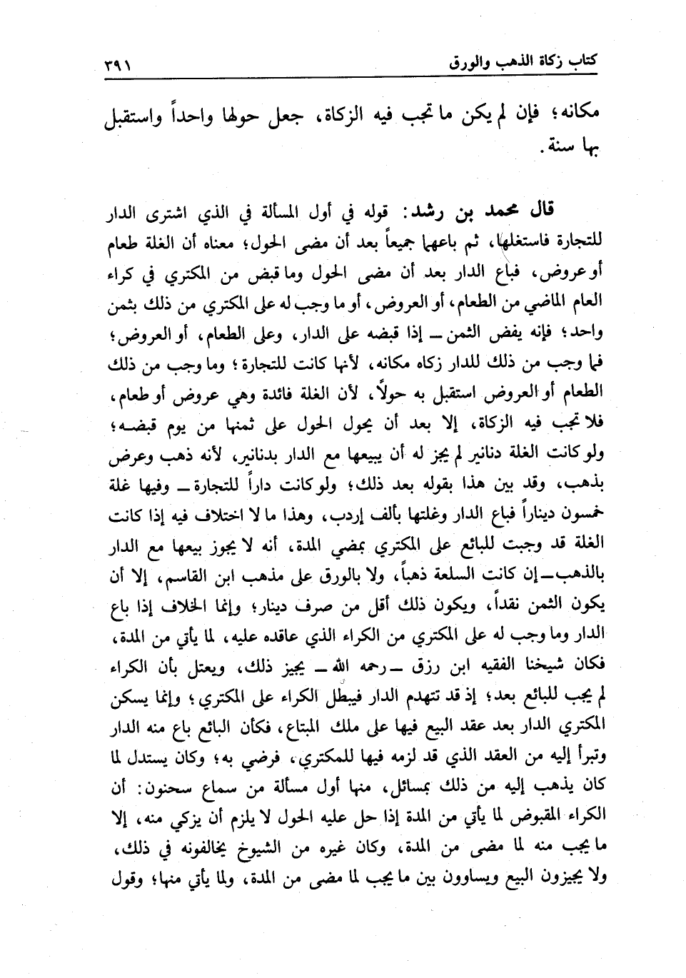 قال محمد بن رشد: قوله في أول المسألة في الذي اشترى الدار للتجارة فاستغلها، ثم باعهما جميعا بعد أن مضى الحول، معناه أن الغلة طعام أو عروض، فباع الدار بعد أن مضى الحول وما قبض من المكتري في كراء العام الماضي من الطعام، أو العروض، أو ما وجب له على المكتري من ذلك بثمن واحد؛ فإنه يفض الثمن - إذا قبضه على الدار، وعلى الطعام، أو العروض، فما وجب من ذلك للدار زكاه مكانه؛ لأنها كانت للتجارة؛ وما وجب من ذلك الطعام أو العروض استقبل به حولا؛ لأن الغلة فائدة وهي عروض أو طعام، فلا تجب فيه الزكاة، إلا بعد أن يحول الحول على ثمنها من يوم قبضه؛ ولو كانت الغلة دنانير لم يجز له أن يبيعها مع الدار بدنانير؛ لأنه ذهب وعرض بذهب، وقد بين هذا بقوله بعد ذلك، ولو كانت دارا للتجارة - وفيها غلة خمسون دينارا، فباع الدار وغلتها بألف إردب، وهذا ما لا اختلاف فيه إذا كانت الغلة قد وجبت للبائع على المكتري بمضي المدة، أنه لا يجوز بيعها مع الدار بالذهب - إن كانت السلعة ذهبا، ولا بالورق على مذهب ابن القاسم، إلا أن يكون الثمن نقدا، ويكون ذلك أقل من صرف دينار؛ وإنما الخلاف إذا باع الدار وما وجب له على المكتري من الكراء الذي عاقده عليه، لما يأتي من المدة، فكان شيخنا الفقيه ابن رزق - رَحِمَهُ اللَّهُ - يجيز ذلك، ويعتل بأن الكراء لم يجب للبائع بعد، إذ قد تتهدم الدار فيبطل الكراء على المكتري، وإنما يسكن المكتري الدار بعد عقد البيع فيها على ملك المبتاع، فكأن البائع باع منه الدار وتبرأ إليه من العقد الذي قد لزمه فيها للمكتري، فرضي به، وكان يستدل لما كان يذهب إليه من ذلك بمسائل، منها أول مسألة من سماع سحنون: أن الكراء المقبوض لما يأتي من المدة إذا حل عليه الحول لا يلزم أن يزكي منه، إلا ما يجب منه لما مضى من المدة، وكان غيره من الشيوخ يخالفونه في ذلك، ولا يجيزون البيع ويساوون بين ما يجب لما مضى من المدة، ولما يأتي منها؛ وقول