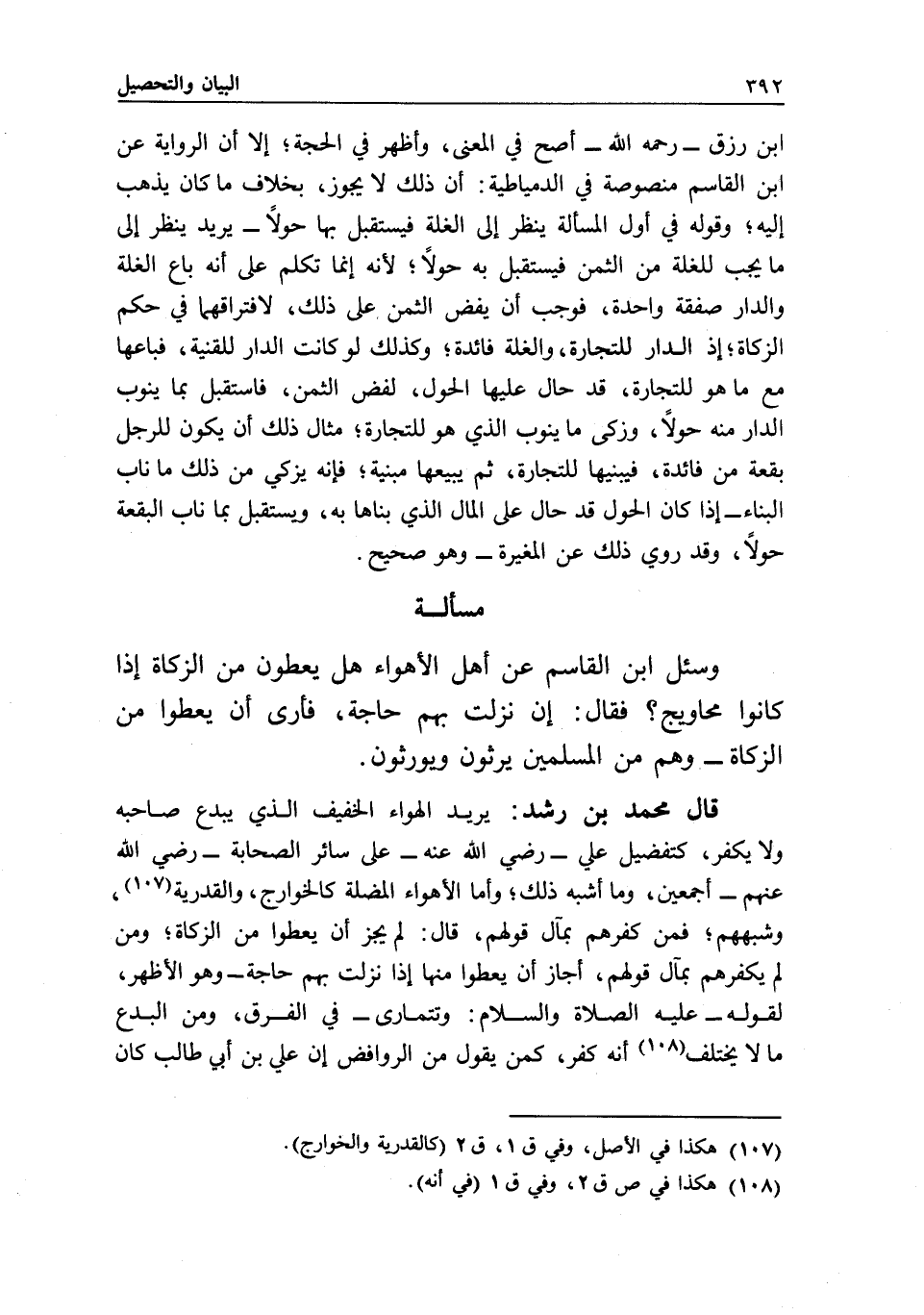 مسألة وسئل ابن القاسم: عن أهل الأهواء هل يعطون من الزكاة إذا كانوا محاويج، فقال: إن نزلت بهم حاجة، فأرى أن يعطوا من الزكاة - وهم من المسلمين يرثون ويورثون.