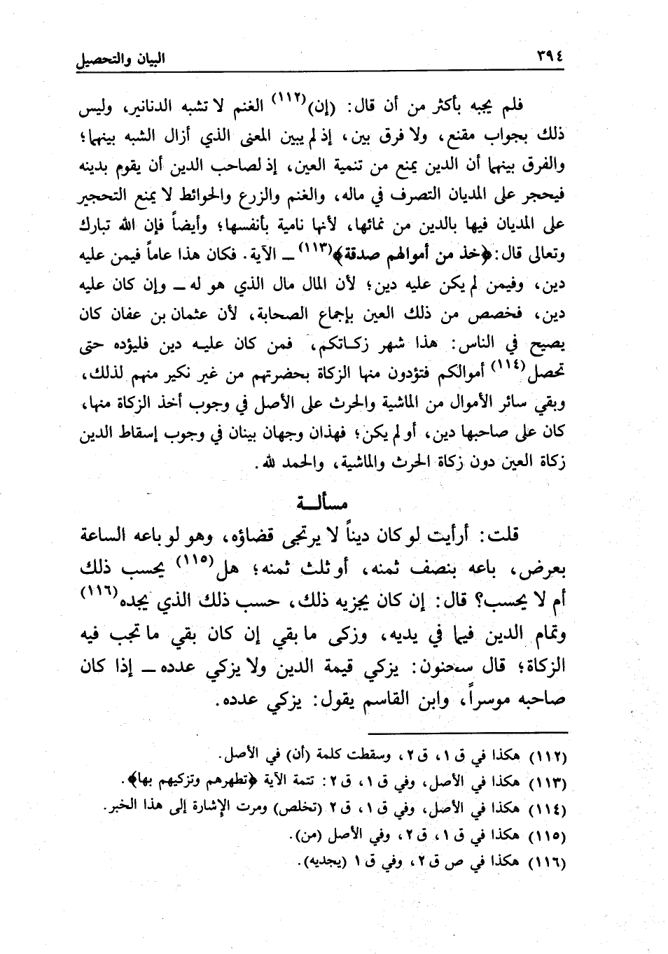 فلم يجبه بأكثر من أن قال: (إن) الغنم لا تشبه الدنانير، وليس ذلك بجواب مقنع، ولا فرق بين، إذ لم يبين المعنى الذي أزال الشبه بينهما؛ والفرق بينهما أن الدين يمنع من تنمية العين، إذ لصاحب الدين أن يقوم بدينه فيحجر على المديان التصرف في ماله، والغنم والزرع والحوائط لا يمنع التحجير على المديان فيها بالدين من نمائها؛ لأنها نامية بأنفسها، وأيضا فإن الله تبارك وتعالى قال: {خُذْ مِنْ أَمْوَالِهِمْ صَدَقَةً} [التوبة: 103]- الآية، فكان هذا عاما فيمن عليه دين، وفيمن لم يكن عليه دين؛ لأن المال مال الذي هو له - وإن كان عليه دين، فخصص من ذلك العين بإجماع الصحابة؛ لأن عثمان بن عفان كان يصيح في الناس: هذا شهر زكاتكم، فمن كان عليه دين فليؤده حتى تحصل أموالكم، فتؤدون منها الزكاة بحضرتهم من غير نكير منهم لذلك، وبقي سائر الأموال من الماشية والحرث على الأصل في وجوب أخذ الزكاة منها، كان على صاحبها دين، أو لم يكن، فهذان وجهان بينان في وجوب إسقاط الدين زكاة العين دون زكاة الحرث والماشية، والحمد لله.