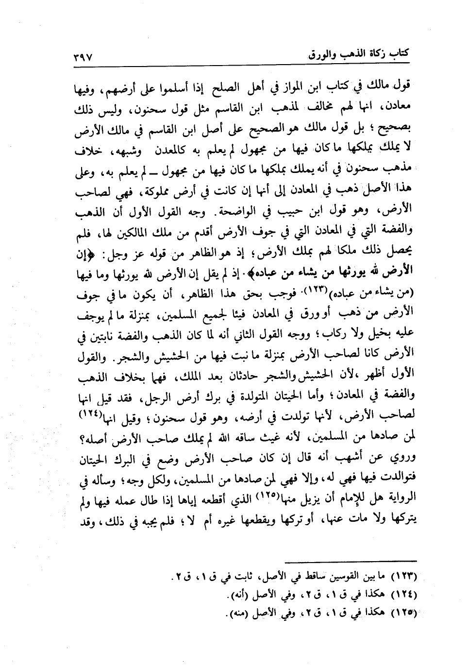 وجه القول الأول أن الذهب والفضة التي في المعادن التي في جوف الأرض، أقدم من ملك المالكين لها، فلم يحصل ذلك ملكا لهم بملك الأرض، إذ هو الظاهر من قوله عز وجل: {إِنَّ الأَرْضَ لِلَّهِ يُورِثُهَا مَنْ يَشَاءُ مِنْ عِبَادِهِ} [الأعراف: 128] ، إذ لم يقل إن الأرض لله يورثها وما فيها (من يشاء من عباده) ، فوجب بحق هذا الظاهر، أن يكون ما في جوف الأرض من ذهب أو ورق في المعادن فيئا لجميع المسلمين، بمنزلة ما لم يوجف عليه بخيل ولا ركاب؛ ووجه القول الثاني أنه لما كان الذهب والفضة نابتين في الأرض كانا لصاحب الأرض بمنزلة ما نبت فيها من الحشيش والشجر.