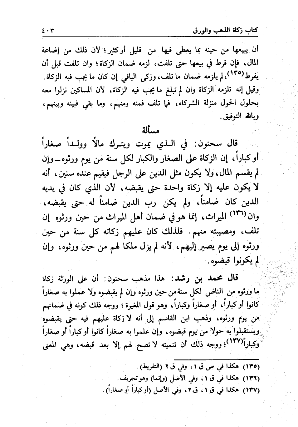 قال محمد بن رشد: هذا مذهب سحنون: أن على الورثة زكاة ما ورثوه من الناض لكل سنة من حين ورثوه، وإن لم يقبضوه ولا علموا به صغارا كانوا أو كبارا، أو صغارا وكبارا، وهو قول المغيرة؛ ووجه ذلك كونه في ضمانهم من يوم ورثوه، وذهب ابن القاسم إلى أنه لا زكاة عليهم فيه حتى يقبضوه ويستقبلوا به حولا من يوم قبضوه، وإن علموا به صغارا كانوا أو كبارا أو صغارا وكبارا، ووجه ذلك أن تنميته لا تصح لهم إلا بعد قبضه، وهي المعنى