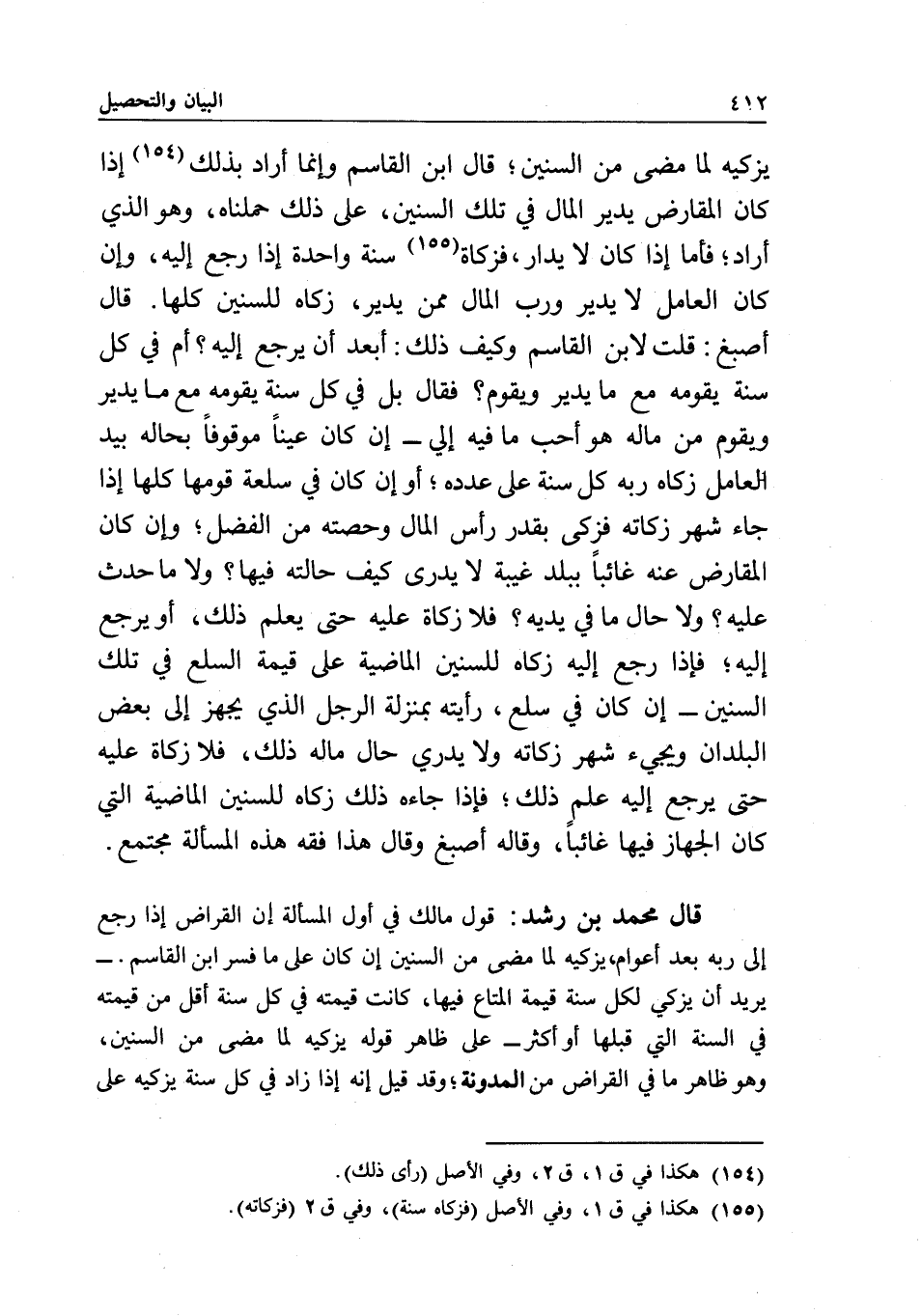 يزكيه لما مضى من السنين؛ قال ابن القاسم: وإنما أراد بذلك إذا كان المقارض يدير المال في تلك السنين، على ذلك حملناه، وهو الذي أراد، فأما إذا كان لا يدار، فزكاة سنة واحدة إذا رجع إليه، وإن كان العامل لا يدير، ورب المال ممن يدير، زكاه للسنين كلها.
