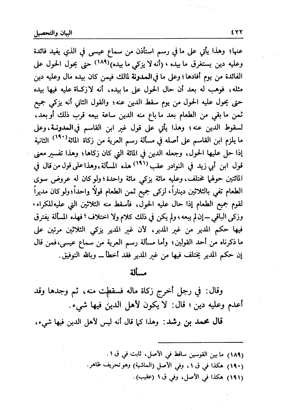 عنها؛ وهذا يأتي على ما في رسم "استأذن" من سماع عيسى في الذي يفيد فائدة، وعليه دين يستغرق ما بيده، (أنه لا يزكي ما بيده) حتى يحول الحول على الفائدة من يوم أفادها؛ وعلى ما في المدونة لمالك فيمن كان بيده مال وعليه دين مثله، فوهب له بعد أن حال الحول على ما بيده، أنه لا زكاة عليه فيها بيده حتى يحول عليه الحول من يوم سقط الدين عنه، والقول الثاني: أنه يزكي جميع ثمن ما بقي من الطعام بعد ما باع منه الدين ساعة بيعه قرب ذلك أو بعد، لسقوط الدين عنه، وهذا يأتي على قول غير ابن القاسم في المدونة، وعلى ما يلزم ابن القاسم على أصله في مسألة رسم "العرية" من زكاة المائة الثانية إذا حل عليها الحول، وجعله الدين في المائة التي كان زكاها، وهذا تفسير معنى قول ابن أبي زيد في النوادر عقب هذه المسألة، وهذا على قول من قال في المائتين حولهما مختلف، وعليه مائة يزكي مائة واحدة؛ ولو كان له عروض سوى الطعام تفي بالثلاثين دينارا، لزكى جميع ثمن الطعام قولا واحدا، ولو كان مديرا لقوم جميع الطعام إذا حال عليه الحول، فأسقط منه الثلاثين التي عليه للكراء، وزكى الباقي - إن لم يبعه، ولم يكن في ذلك كلام، ولا اختلاف؛ فهذه المسألة يفترق فيها حكم المدير من غير المدير؛ لأن غير المدير يزكي الثلاثين مرتين على ما ذكرناه من أحد القولين، وأما مسألة رسم "العرية" من سماع عيسى، فمن قال: إن حكم المدير يختلف فيها من غير المدير فقد أخطأ - وبالله التوفيق.