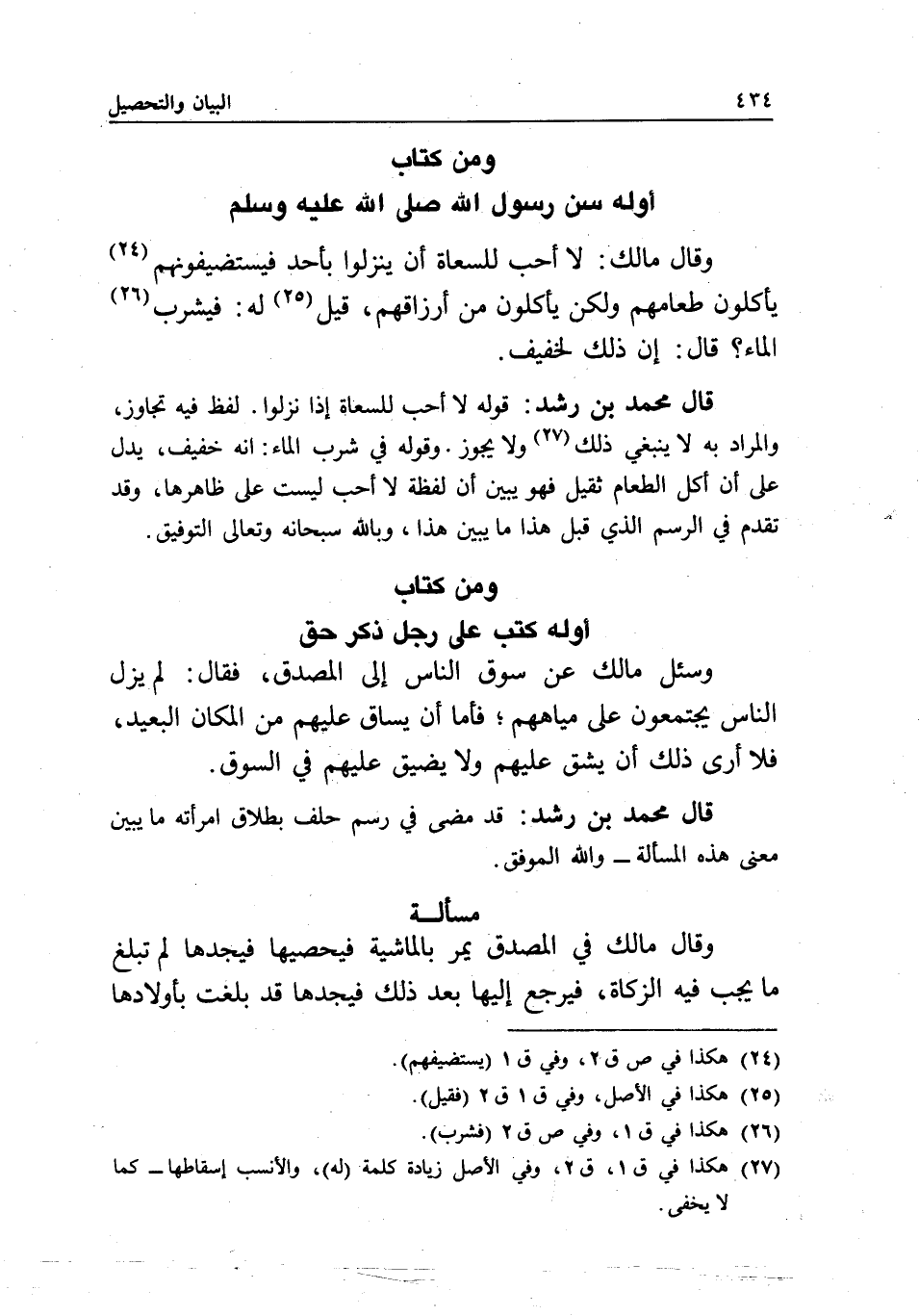 ومن كتاب أوله سن رسول الله - صَلَّى اللَّهُ عَلَيْهِ وَسَلَّمَ - وقال مالك: لا أحب للسعاة أن ينزلوا بأحد فيستضيفونهم يأكلون طعامهم، ولكن يأكلون من أرزاقهم، قيل له: فيشرب الماء؟ قال: إن ذلك لخفيف.