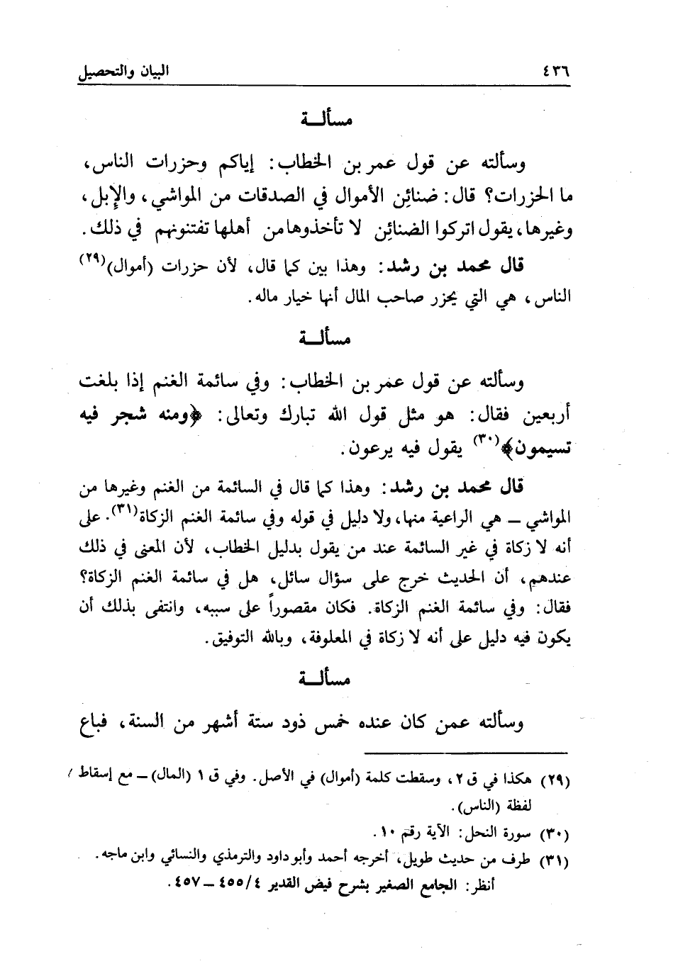 مسألة وسألته عن قول عمر بن الخطاب: وفي سائمة الغنم إذا بلغت أربعين فقال: هو مثل قول الله تبارك وتعالى: {وَمِنْهُ شَجَرٌ فِيهِ تُسِيمُونَ} [النحل: 10] يقول فيه يرعون.