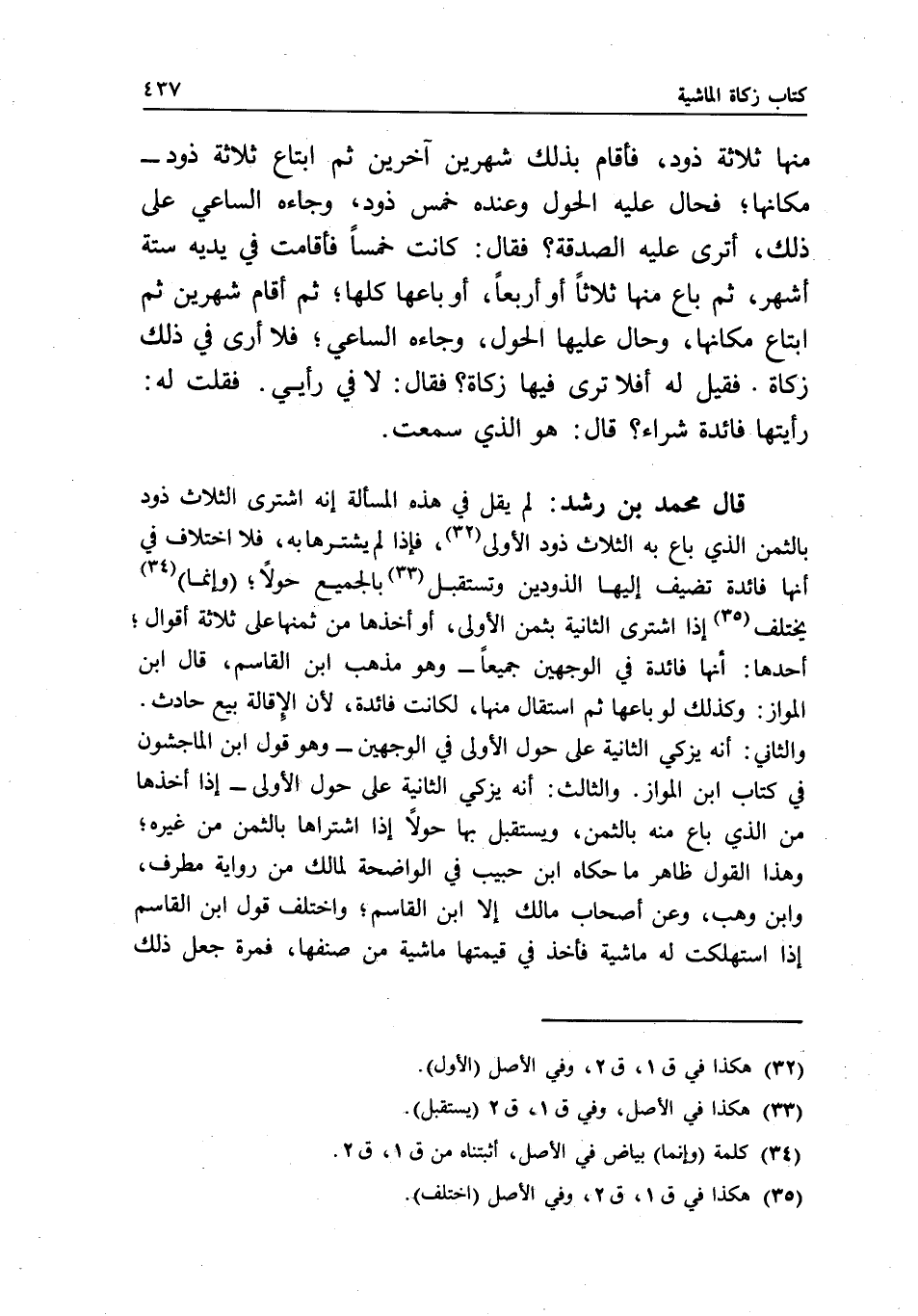 والثاني: أنه يزكي الثانية على حول الأولى في الوجهين - وهو قول ابن الماجشون في كتاب ابن المواز. والثالث: أنه يزكي الثانية على حول الأولى - إذا أخذها من الذي باع منه بالثمن، ويستقبل بها حولا إذا اشتراها بالثمن من غيره؛ وهذا القول ظاهر ما حكاه ابن حبيب في الواضحة لمالك من رواية مطرف، وابن وهب، وعن أصحاب مالك إلا ابن القاسم؛ واختلف قول ابن القاسم إذا استهلكت له ماشية فأخذ في قيمتها ماشية من صنفها، فمرة جعل ذلك