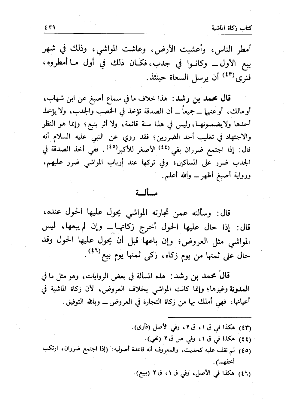 قال محمد بن رشد: هذه المسألة في بعض الروايات، وهو مثل ما في المدونة وغيرها، وإنما كانت المواشي بخلاف العروض؛ لأن زكاة الماشية في أعيانها، فهي أملك بها من زكاة التجارة في العروض - وبالله التوفيق.