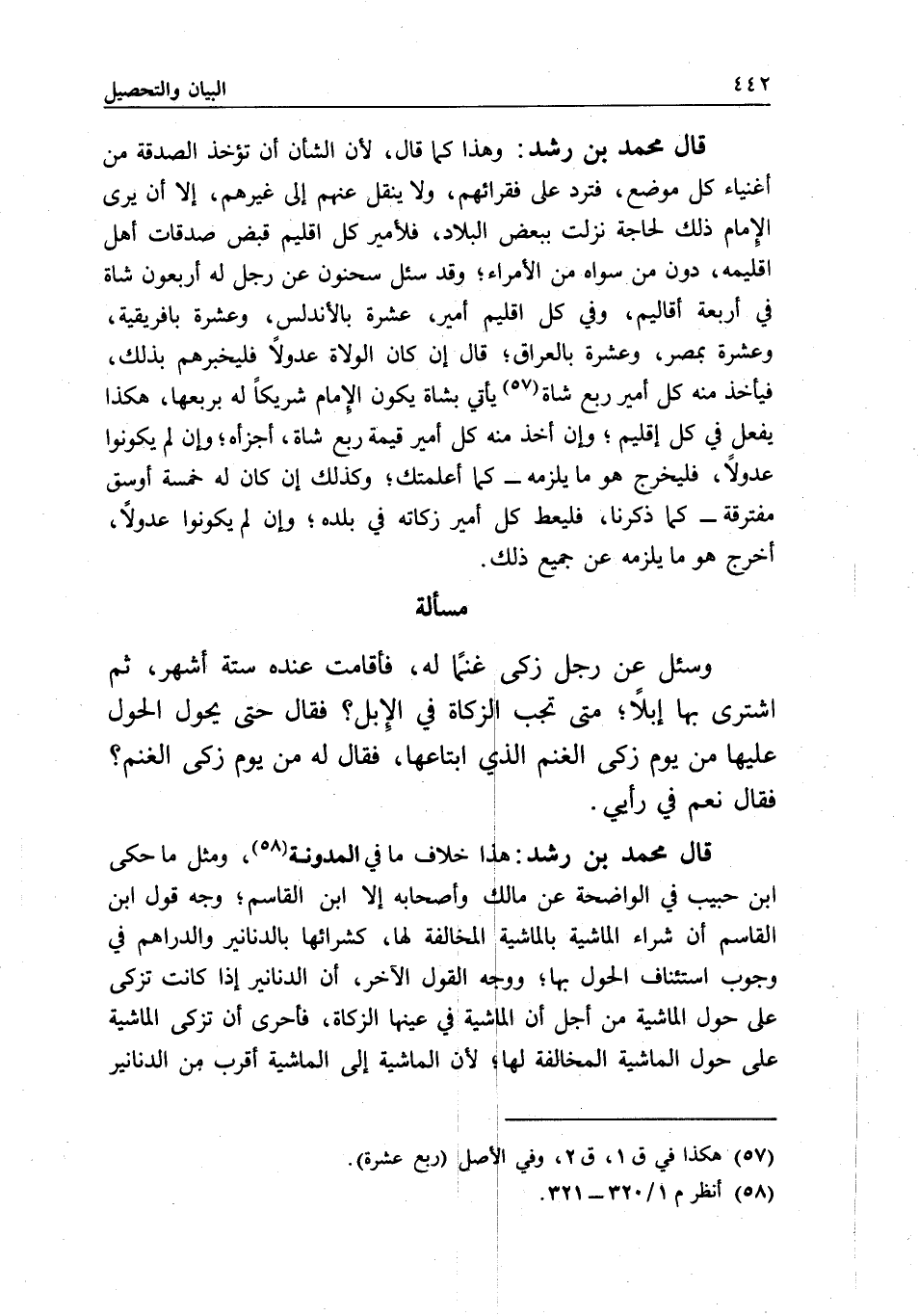 قال محمد بن رشد: هذا خلاف ما في المدونة، ومثل ما حكى ابن حبيب في الواضحة عن مالك وأصحابه إلا ابن القاسم؛ وجه قول ابن القاسم أن شراء الماشية بالماشية المخالفة لها، كشرائها بالدنانير والدراهم في وجوب استئناف الحول بها، ووجه القول الآخر، أن الدنانير إذا كانت تزكى على حول الماشية من أجل أن الماشية في عينها الزكاة، فأحرى أن تزكى الماشية على حول الماشية المخالفة لها؛ لأن الماشية إلى الماشية أقرب من الدنانير