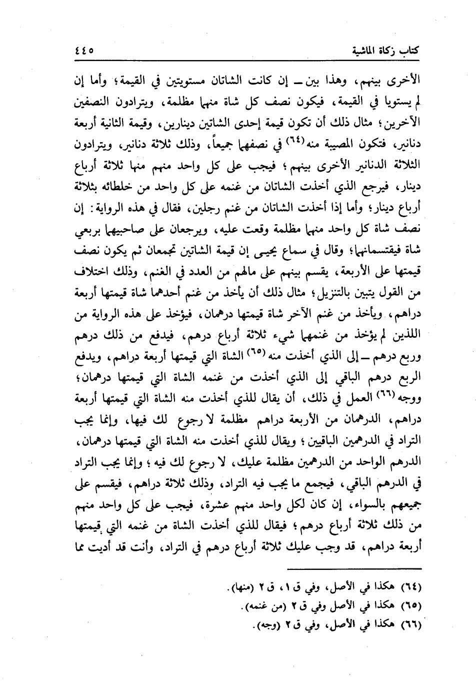 الأخرى بينهم، وهذا بين - إن كانت الشاتان مستويتين في القيمة؛ وأما إن لم يستويا في القيمة، فيكون نصف كل شاة منهما مظلمة، ويترادون النصفين الآخرين؛ مثال ذلك أن تكون قيمة إحدى الشاتين دينارين، وقيمة الثانية أربعة دنانير، فتكون المصيبة منه في نصفهما جميعا، وذلك ثلاثة دنانير، ويترادون الثلاثة الدنانير الأخرى بينهم؛ فيجب على كل واحد منهم منها ثلاثة أرباع دينار، فيرجع الذي أخذت الشاتان من غنمه على كل واحد من خلطائه بثلاثة أرباع دينار؛ وأما إذا أخذت الشاتان من غنم رجلين، فقال في هذه الرواية: إن نصف شاة كل واحد منهما مظلمة وقعت عليه، ويرجعان على صاحبيهما بربعي شاة فيقتسمانهما، وقال في سماع يحيى: إن قيمة الشاتين تجمعان ثم يكون نصف قيمتها على الأربعة، يقسم بينهم على مالهم من العدد في الغنم، وذلك اختلاف من القول يتبين بالتنزيل، مثال ذلك أن يأخذ من غنم أحدهما شاة قيمتها أربعة دراهم، ويأخذ من غنم الآخر شاة قيمتها درهمان، فيؤخذ على هذه الرواية من اللذين لم يؤخذ من غنمهما شيء ثلاثة أرباع درهم، فيدفع من ذلك درهم وربع درهم - إلى الذي أخذت منه الشاة التي قيمتها أربعة دراهم، ويدفع الربع درهم الباقي إلى الذي أخذت من غنمه الشاة التي قيمتها درهمان، ووجه العمل في ذلك، أن يقال للذي أخذت منه الشاة التي قيمتها أربعة دراهم: الدرهمان من الأربعة دراهم مظلمة لا رجوع لك فيها، وإنما يجب التراد في الدرهمين الباقيين؛ ويقال للذي أخذت منه الشاة التي قيمتها درهمان: الدرهم الواحد من الدرهمين مظلمة عليك، لا رجوع لك فيه، وإنما يجب التراد في الدرهم الباقي، فيجمع ما يجب فيه التراد، وذلك ثلاثة دراهم، فيقسم على جميعهم بالسواء، إن كان لكل واحد منهم عشرة، فيجب على كل واحد منهم من ذلك ثلاثة أرباع درهم؛ فيقال للذي أخذت الشاة من غنمه التي قيمتها أربعة دراهم: قد وجب عليك ثلاثة أرباع درهم في التراد، وأنت قد أديت مما