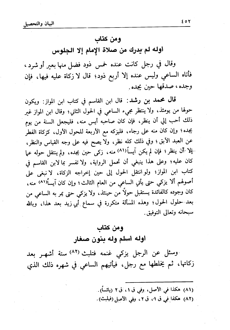 قال محمد بن رشد: قال ابن القاسم في كتاب ابن المواز: ويكون حولها من يومئذ، ولا ينتظر مجيء الساعي في الحول الثاني، وقال ابن المواز غير ذلك أحب إلي أن ينظر، فإن كان صاحبه أيس منه، فليجعل السنة من يوم يجده؛ وإن كان منه على رجاء، فليزكه مع الأربعة للحول الأول، كزكاة الفطر عن العبد الآبق، وفي ذلك كله نظر، ولا يصح فيه على وجه القياس والنظر، إلا أن ينظر؛ فإن لم يكن آيسا منه، زكى حين يجده، ولم ينتقل حوله عما كان عليه، وعلى هذا ينبغي أن تحمل الرواية، ولا تفسر بما لابن القاسم في كتاب ابن المواز؛ ولو انتقل الحول إلى حين إخراجه الزكاة، لا نبغي على أصولهم ألا يزكي حتى يأتي الساعي من العام الثالث، وإن كان آيسا منه، كان وجوده كالفائدة يستقبل حولا من حينئذ، ولا يزكي حتى يمر به الساعي من بعد حلول الحول؛ وهذه المسألة متكررة في سماع أبي زيد بعد هذا، وبالله سبحانه وتعالى التوفيق.