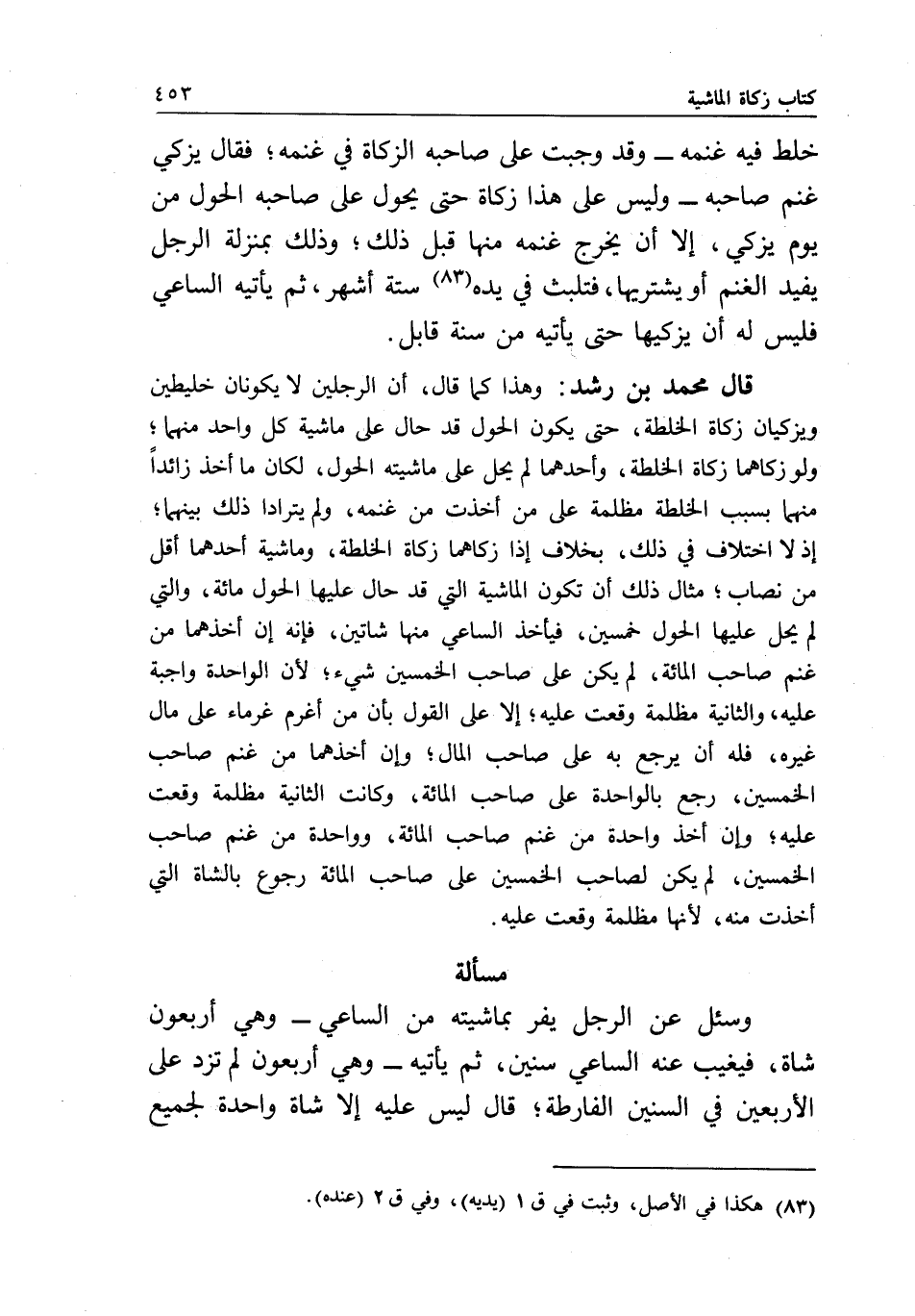 قال محمد بن رشد: وهذا كما قال: أن الرجلين لا يكونان خليطين ويزكيان زكاة الخلطة، حتى يكون الحول قد حال على ماشية كل واحد منهما؛ ولو زكاهما زكاة الخلطة، وأحدهما لم يحل على ماشيته الحول، لكان ما أخذ زائدا منهما بسبب الخلطة مظلمة على من أخذت من غنمه، ولم يترادا ذلك بينهما؛ إذ لا اختلاف في ذلك، بخلاف إذا زكاهما زكاة الخلطة، وماشية أحدهما أقل من نصاب؛ مثال ذلك أن تكون الماشية التي قد حال عليها الحول مائة، والتي لم يحل عليها الحول خمسين، فيأخذ الساعي منها شاتين، فإنه إن أخذهما من غنم صاحب المائة، لم يكن على صاحب الخمسين شيء؛ لأن الواحدة واجبة عليه، والثانية مظلمة وقعت عليه؛ إلا على القول بأن من أغرم غرماء على مال غيره، فله أن يرجع به على صاحب المال؛ وإن أخذهما من غنم صاحب الخمسين، رجع بالواحدة على صاحب المائة، وكانت الثانية مظلمة وقعت عليه، وإن أخذ واحدة من غنم صاحب المائة، وواحدة من غنم صاحب الخمسين، لم يكن لصاحب الخمسين على صاحب المائة رجوع بالشاة التي أخذت منه؛ لأنها مظلمة وقعت عليه.