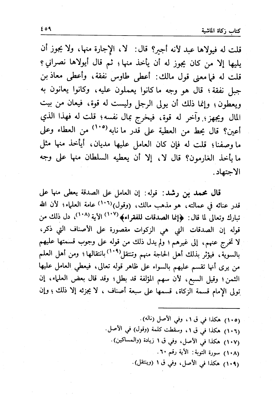 قلت له: فيولاها عبد لأنه أجير، قال: لا، الإجارة منها، ولا يجوز أن يليها إلا من كان يجوز له أن يأخذ منها، ثم قال أيولاها نصراني؟ قلت له: فما معنى قول مالك: أعطى طاووس نفقة، وأعطى معاذ بن جبل نفقة؛ قال: هو وجه ما كانوا يعملون عليه، وكانوا يعانون به ويعطون، وإنما ذلك أن يولى الرجل وليست له قوة، فيعان من بيت المال ويجهز، وآخر له قوة، فيخرج بمال نفسه؛ قلت له: فهذا الذي أعين؟ قال: يحط من العطية على قدر ما نابه من العطاء، وعلى ما وصفنا؛ قلت له: فإن كان العامل عليها مديان، أيأخذ منها مثل ما يأخذ الغارمون، قال: لا، إلا أن يعطيه السلطان منها على وجه الاجتهاد.
