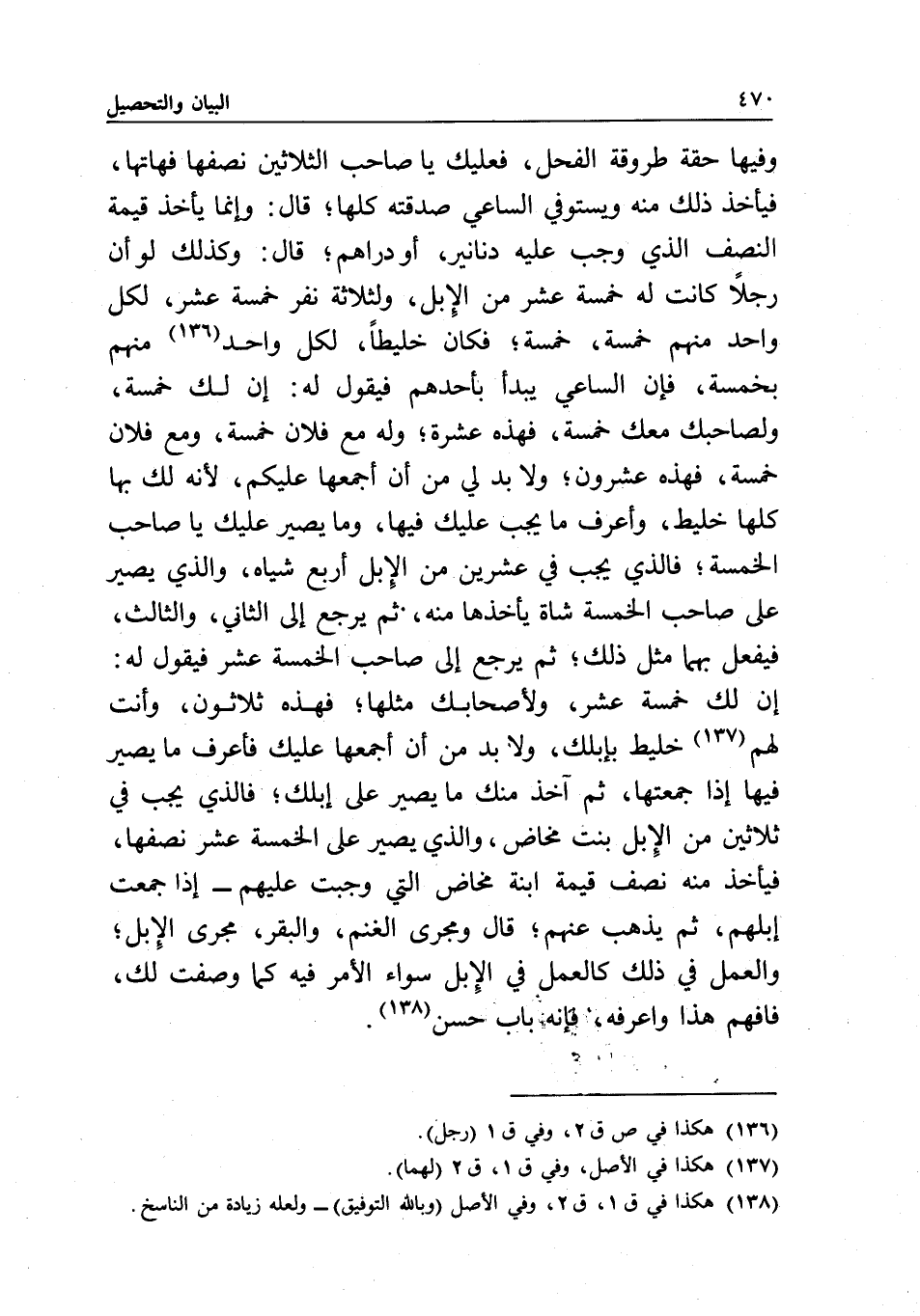 وفيها حقة طروقة الفحل، فعليك يا صاحب الثلاثين نصفها فهاتها، فيأخذ ذلك منه ويستوفي الساعي صدقته كلها؛ قال: وإنما يأخذ قيمة النصف الذي وجب عليه دنانير، أو دراهم، قال: وكذلك لو أن رجلا كانت له خمسة عشر من الإبل، ولثلاثة نفر خمسة عشر، لكل واحد منهم خمسة، خمسة؛ فكان خليطا، لكل واحد منهم بخمسة، فإن الساعي يبدأ بأحدهم فيقول له: إن لك خمسة، ولصاحبك معك خمسة، فهذه عشرة، وله مع فلان خمسة، ومع فلان خمسة، فهذه عشرون؛ ولا بد لي من أن أجمعها عليكم؛ لأنه لك بها كلها خليط، وأعرف ما يجب عليك فيها، وما يصير عليك يا صاحب الخمسة، فالذي يجب في عشرين من الإبل أربع شياه، والذي يصير على صاحب الخمسة شاة يأخذها منه، ثم يرجع إلى الثاني، والثالث، فيفعل بهما مثل ذلك، ثم يرجع إلى صاحب الخمسة عشر فيقول له: إن لك خمسة عشر، ولأصحابك مثلها؛ فهذه ثلاثون، وأنت لهم خليط بإبلك، ولا بد من أن أجمعها عليك فأعرف ما يصير فيها إذا جمعتها، ثم آخذ منك ما يصير على إبلك؛ فالذي يجب في ثلاثين من الإبل بنت مخاض، والذي يصير على الخمسة عشر نصفها، فيأخذ منه نصف قيمة ابنة مخاض التي وجبت عليهم - إذا جمعت إبلهم، ثم يذهب عنهم؛ قال: ومجرى الغنم، والبقر، مجرى الإبل؛ والعمل في ذلك كالعمل في الإبل سواء الأمر فيه كما وصفت لك، فافهم هذا واعرفه، فإنه باب حسن.