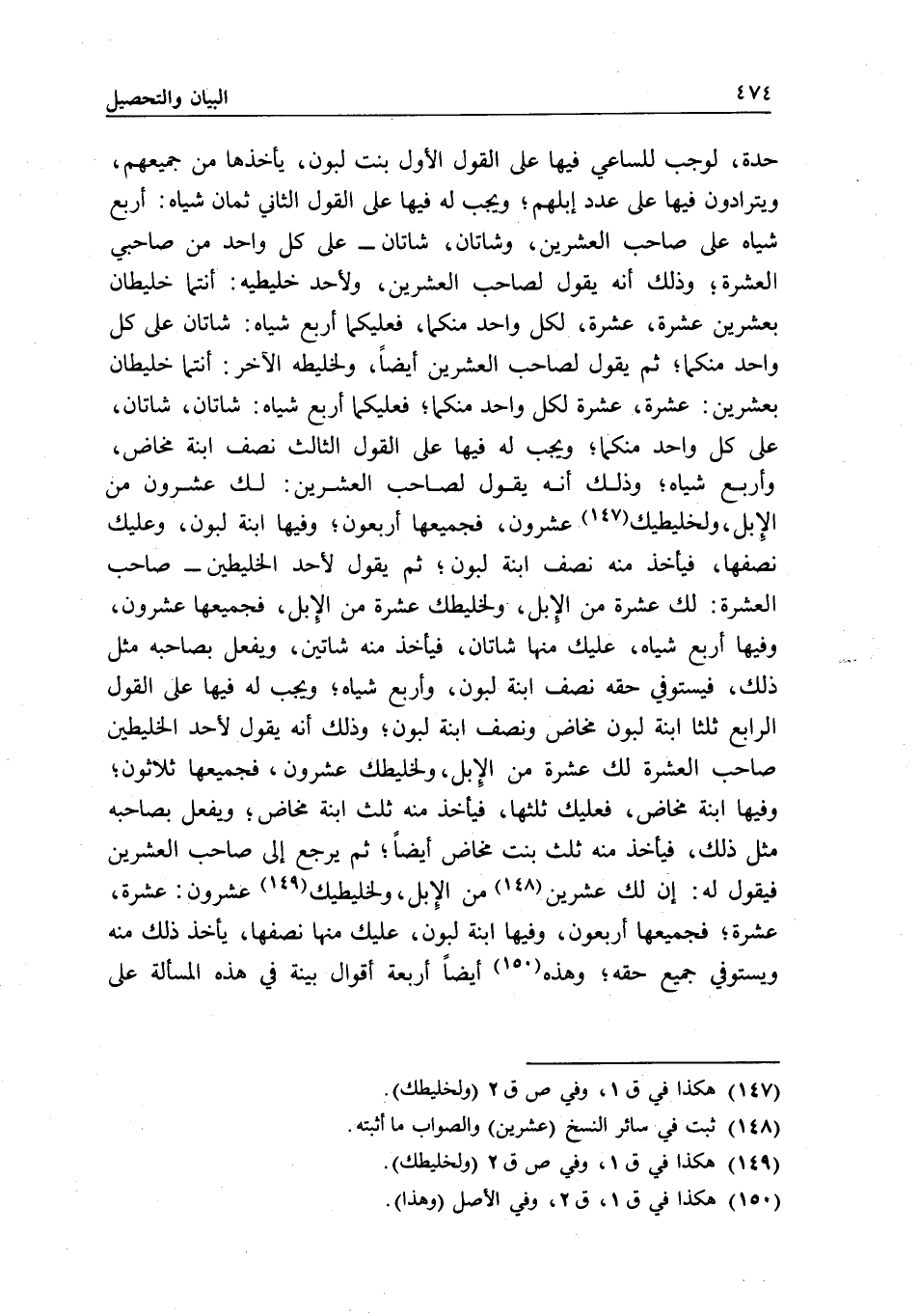 حدة، لوجب للساعي فيها على القول الأول بنت لبون، يأخذها من جميعهم، ويترادون فيها على عدد إبلهم، ويجب له فيها على القول الثاني ثمان شياه: أربع شياه على صاحب العشرين، وشاتان، شاتان - على كل واحد من صاحبي العشرة، وذلك أنه يقول لصاحب العشرين، ولأحد خليطيه: أنتما خليطان بعشرين عشرة، عشرة، لكل واحد منكما، فعليكما أربع شياه: شاتان على كل واحد منكما، ثم يقول لصاحب العشرين أيضا، ولخليطه الآخر: أنتما خليطان بعشرين: عشرة، عشرة لكل واحد منكما، فعليكما أربع شياه: شاتان، شاتان، على كل واحد منكما؛ ويجب له فيها على القول الثالث نصف ابنة مخاض، وأربع شياه؛ وذلك أنه يقول لصاحب العشرين: لك عشرون من الإبل، ولخليطيك عشرون، فجميعها أربعون، وفيها ابنة لبون، وعليك نصفها، فيأخذ منه نصف ابنة لبون، ثم يقول لأحد الخليطين - صاحب العشرة: لك عشرة من الإبل، ولخليطك عشرة من الإبل، فجميعها عشرون، وفيها أربع شياه، عليك منها شاتان، فيأخذ منه شاتين، ويفعل بصاحبه مثل ذلك، فيستوفي حقه نصف ابنة لبون، وأربع شياه، ويجب له فيها على القول الرابع ثلثا ابنة لبون مخاض ونصف ابنة لبون، وذلك أنه يقول لأحد الخليطين صاحب العشرة: لك عشرة من الإبل، ولخليطك عشرون، فجميعها ثلاثون، وفيها ابنة مخاض، فعليك ثلثها، فيأخذ منه ثلث ابنة مخاض، ويفعل بصاحبه مثل ذلك، فيأخذ منه ثلث بنت مخاض أيضا؛ ثم يرجع إلى صاحب العشرين فيقول له: إن لك عشرين من الإبل، ولخليطيك عشرون: عشرة، عشرة، فجميعها أربعون، وفيها ابنة لبون، عليك منها نصفها، يأخذ ذلك منه ويستوفي جميع حقه؛ وهذه أيضا أربعة أقوال بينة في هذه المسألة على