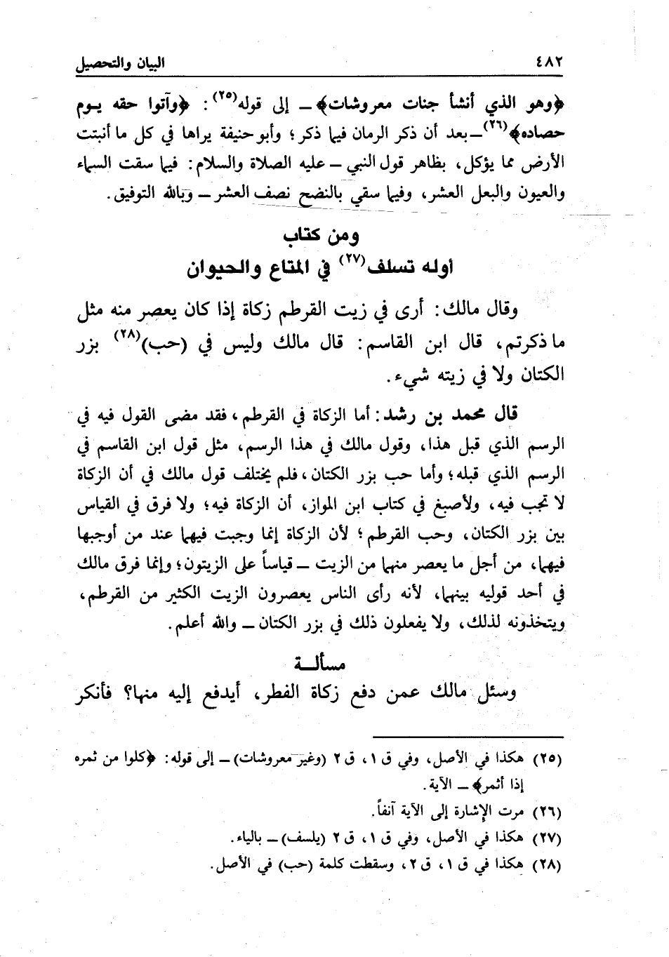 قال محمد بن رشد: أما الزكاة في القرطم، فقد مضى القول فيه في الرسم الذي قبل هذا، وقول مالك في هذا الرسم، مثل قول ابن القاسم في الرسم الذي قبله؛ وأما حب بزر الكتان، فلم يختلف قول مالك في أن الزكاة لا تجب فيه، ولأصبغ في كتاب ابن المواز، أن الزكاة فيه، ولا فرق في القياس بين بزر الكتان، وحب القرطم؛ لأن الزكاة إنما وجبت فيهما عند من أوجبها فيهما، من أجل ما يعصر منهما من الزيت - قياسا على الزيتون؛ وإنما فرق مالك في أحد قوليه بينهما؛ لأنه رأى الناس يعصرون الزيت الكثير من القرطم، ويتخذونه لذلك، ولا يفعلون ذلك في بزر الكتان - والله أعلم.
