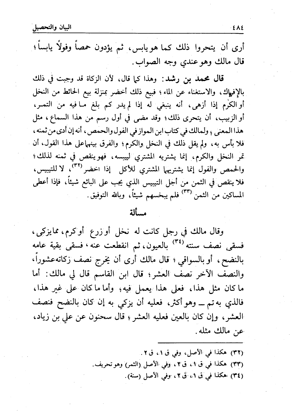 مسألة وقال مالك في رجل كانت له نخل أو زرع أو كرم، مما يزكى، فسقى نصف سنته بالعيون، ثم انقطعت عنه، فسقى بقية عامه بالنضح، أو بالسواقي؛ قال مالك: أرى أن يخرج نصف زكاته عشورا، والنصف الآخر نصف العشر، قال ابن القاسم: قال لي مالك: أما ما كان مثل هذا، فعلى هذا يعمل فيه، وأما ما كان على غير هذا، فالذي به تم - وهو أكثر، فعليه أن يزكي به إن كان بالنضح فنصف العشر، وإن كان بالعين فعليه العشر، قال سحنون عن علي بن زياد، عن مالك مثله.
