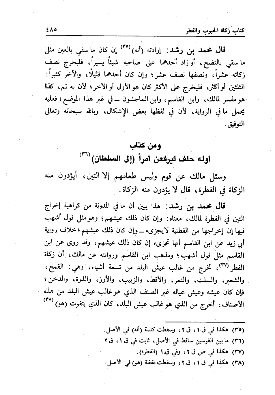 قال محمد بن رشد: هذا يبين أن ما في المدونة من كراهية إخراج التين في الفطرة لمالك، معناه: وإن كان ذلك عيشهم، وهو مثل قول أشهب فيها إن إخراجها من القطنية لا يجزئ - وإن كان ذلك عيشهم، خلاف رواية أبي زيد عن ابن القاسم: أنها تجزئ إن كان ذلك عيشهم، وقد روي عن ابن القاسم مثل قول أشهب؛ ومذهب ابن القاسم وروايته عن مالك، أن زكاة الفطر، تخرج من غالب عيش البلد من تسعة أشياء، وهي: القمح، والشعير، والسلت، والتمر، والأقط، والزبيب، والأرز، والذرة، والدخن؛ فإن كان عيشه وعيش عياله غير الصنف الذي هو غالب عيش البلد من هذه الأصناف، أخرج من الذي هو غالب عيش البلد، كان الذي يتقوت (هو)